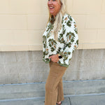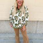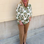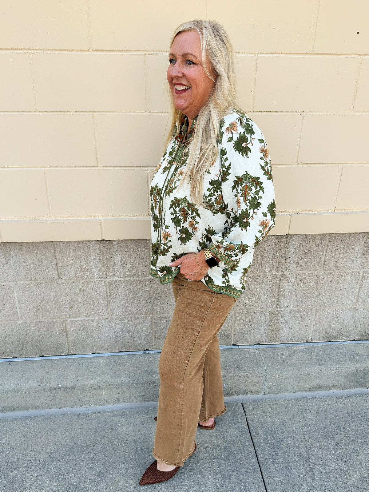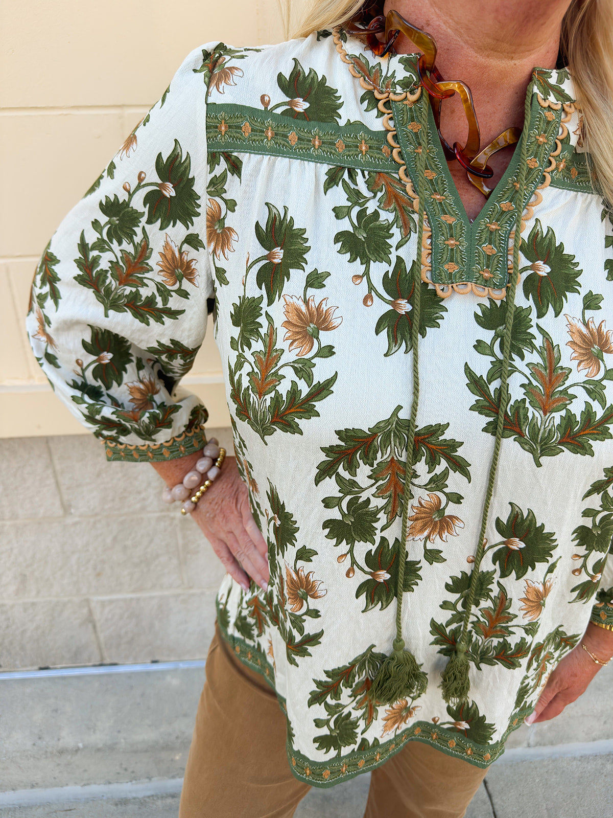 Looking for a top that captures the cozy romance of fall? The Harvest Trails Tassel Blouse is the perfect blend of relaxed elegance and timeless charm. Designed in a soft cream hue with an olive and brown floral print, this blouse feels both earthy and refined. The split neckline with tassel ties adds a playful touch, while decorative trim details bring texture and dimension to the flowy silhouette.