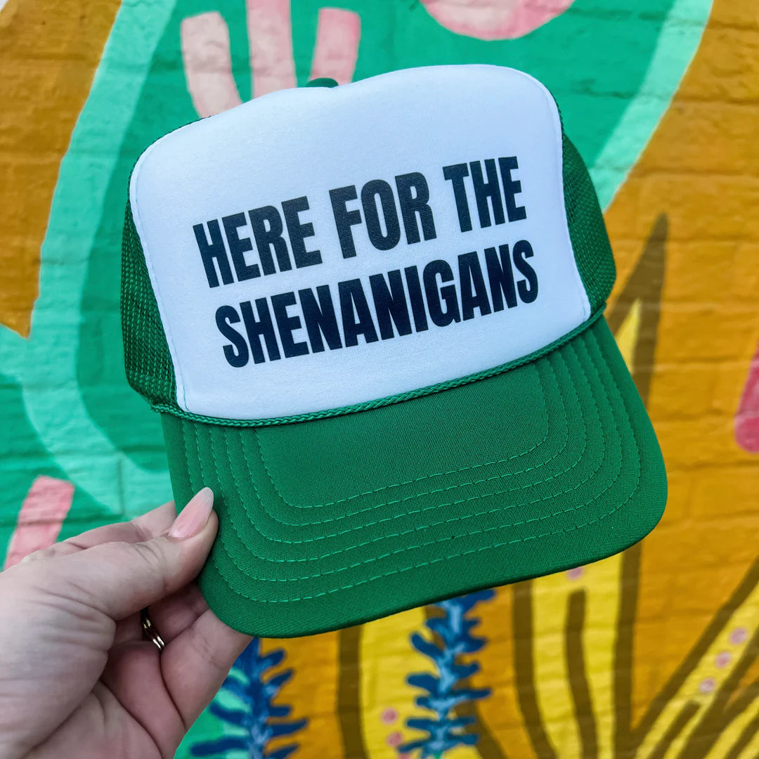 Introduce Here for the Shenanigans Trucker Cap to your summer wardrobe. This snap back trucker hat features a stylish mesh backing, perfect for beach trips or concerts. Stay cool and look cute while sipping on your favorite drink!. A must-have for any fashion-forward individual!