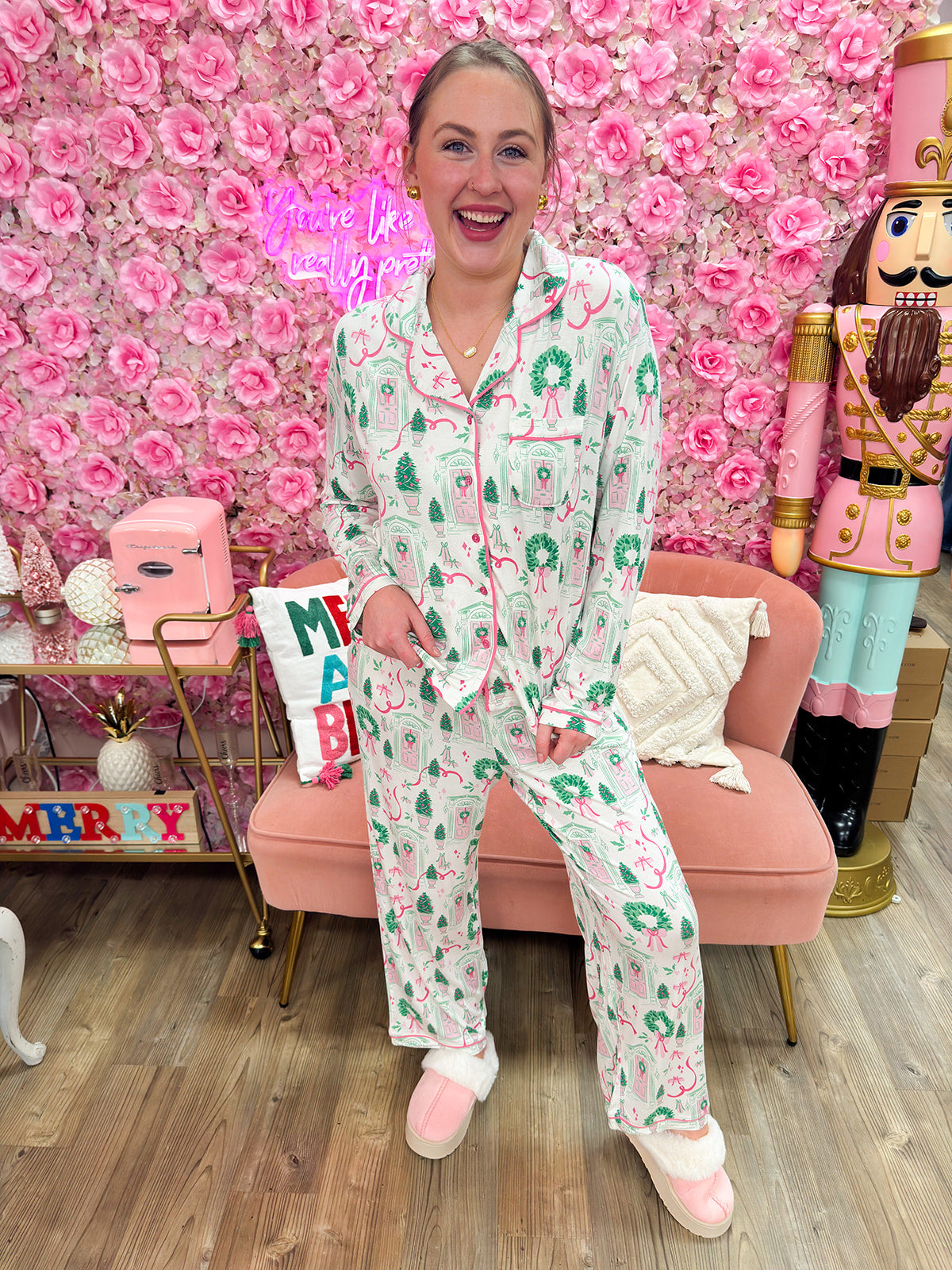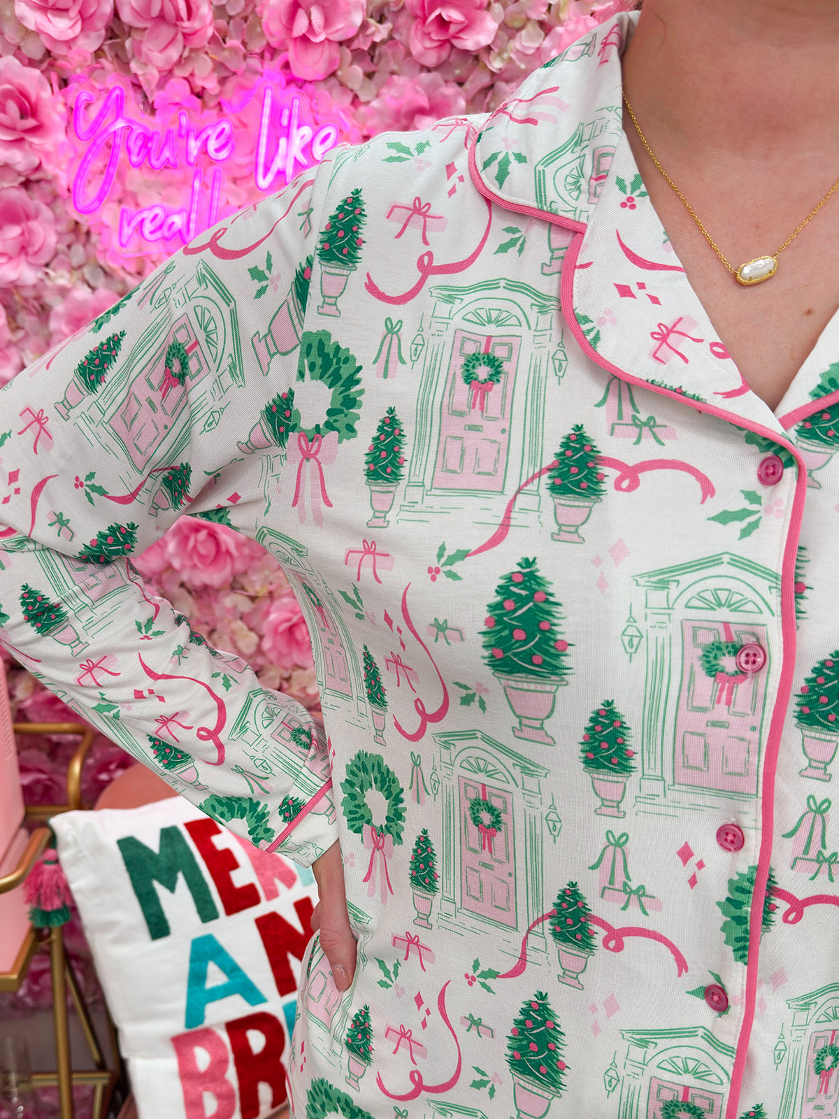 Designed in crisp white with a playful pink and green holiday house pattern, this long-sleeve pajama top features a classic collar and button-down front for a timeless, tailored touch. The matching pants include a drawstring waistband and convenient side pockets for ultimate comfort. Soft, lightweight, and made for lounging, this set is everything you want for cozy winter evenings, Christmas mornings, or fireside cocoa nights.