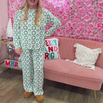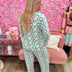Crafted in the same ultra-soft, buttery fabric you love, this long-sleeve crewneck top and matching drawstring pants feature a pink-and-white striped background adorned with green holiday wreaths tied with dainty pink bows. The playful yet polished print feels timelessly festive, while the drawstring waist and side pockets add an easy, relaxed fit that’s perfect for cozying up all season long.