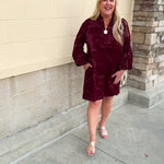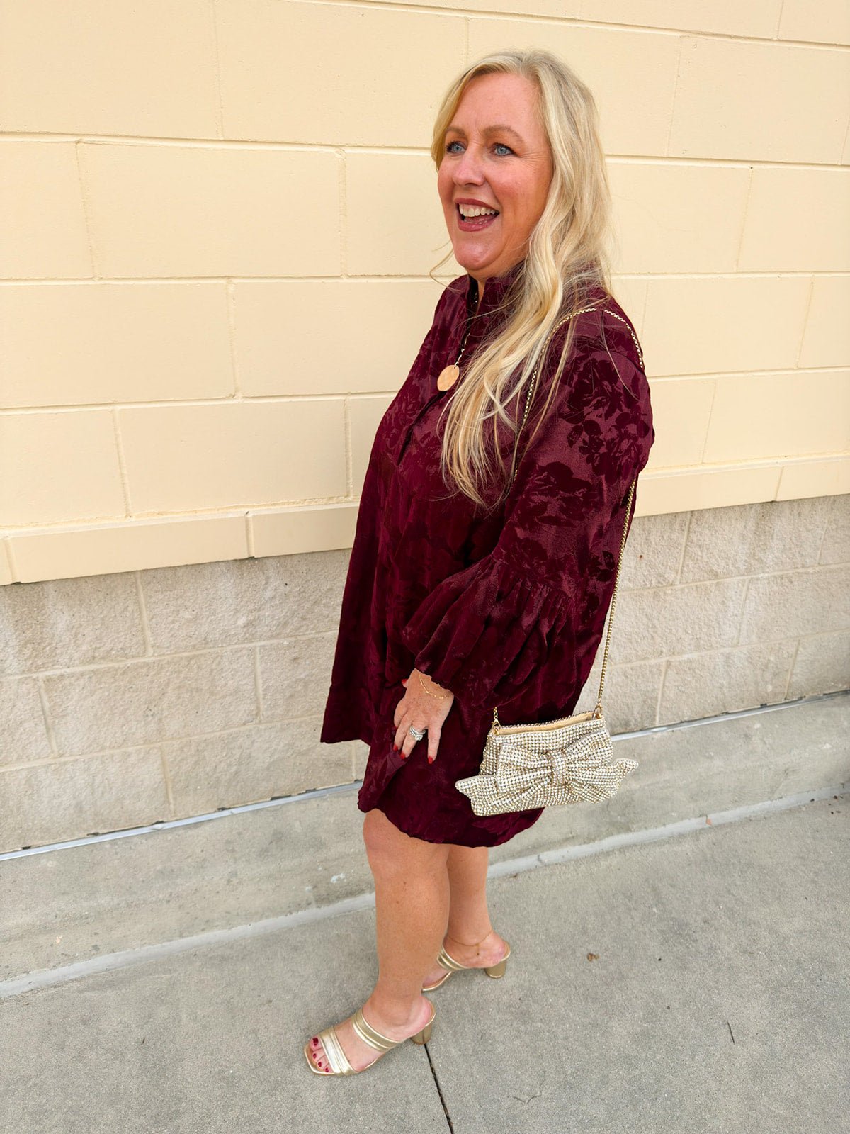 Step into festive elegance with the Holly & Hearth Velvet Mini Dress. Crafted in rich garnet velvet with a subtle tone-on-tone floral jacquard pattern, this mini dress exudes holiday sophistication. The delicate ruffle collar and button-down split neckline add a soft, feminine touch, while the 3/4-length puff sleeves give a modern, playful silhouette. Designed to flatter and move with ease, this dress is a perfect choice for holiday parties, seasonal gatherings, or a chic winter date night.