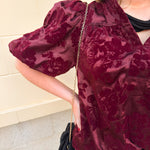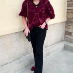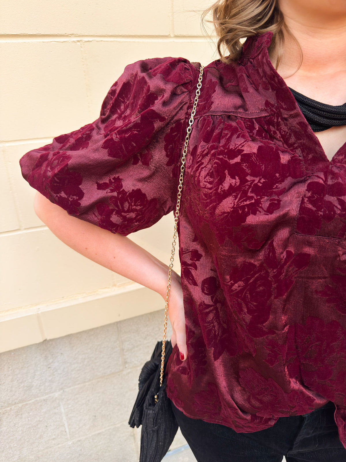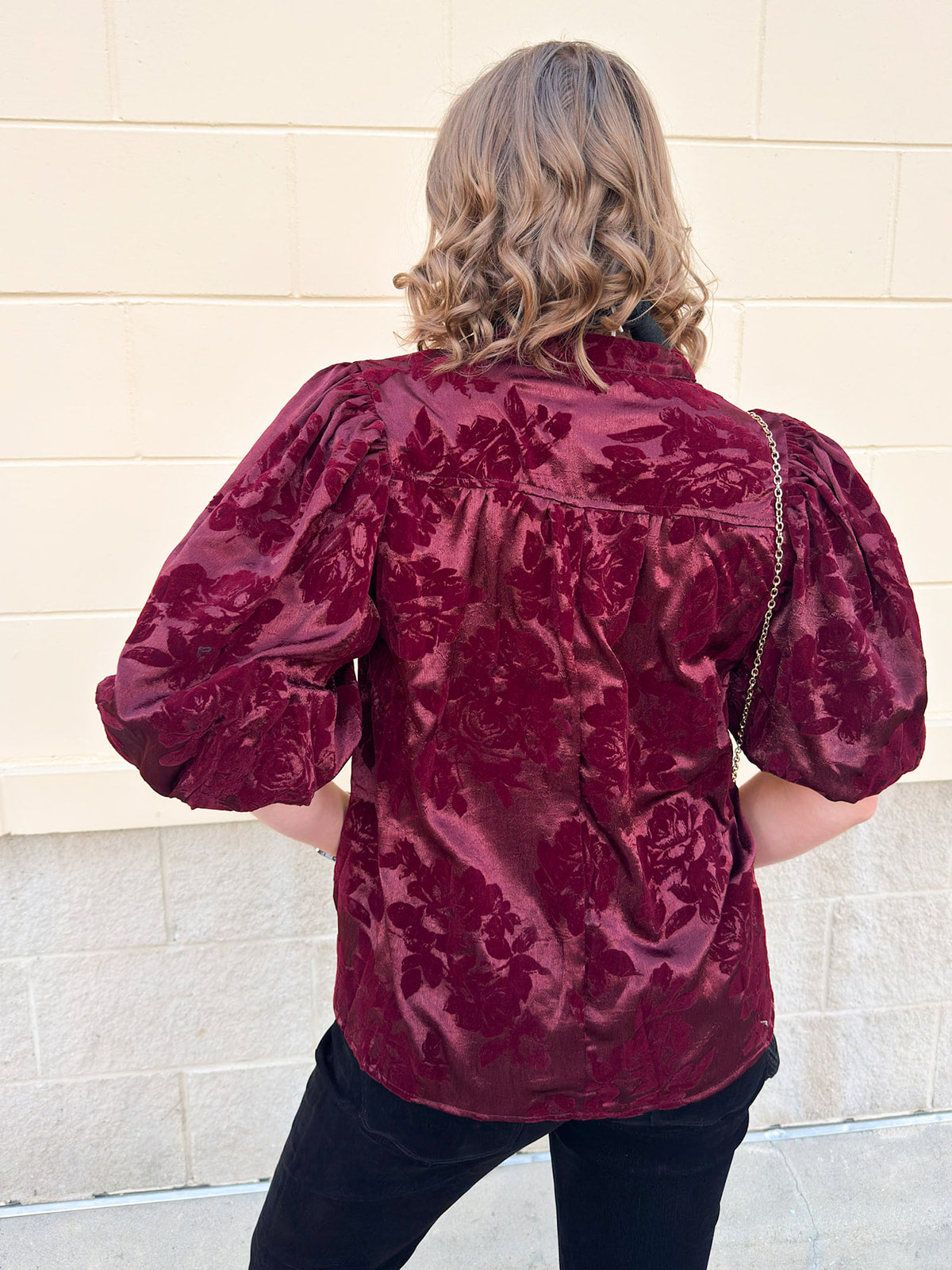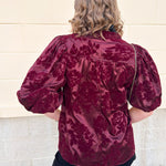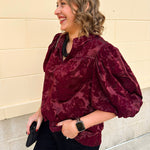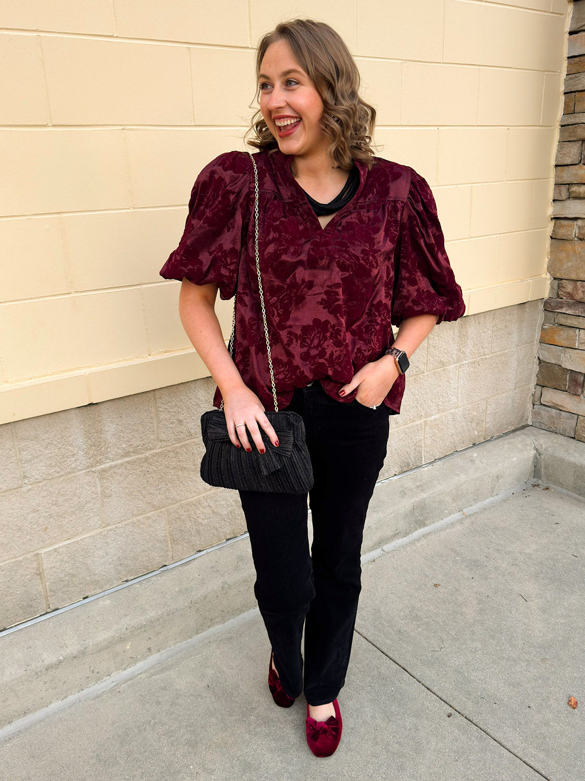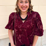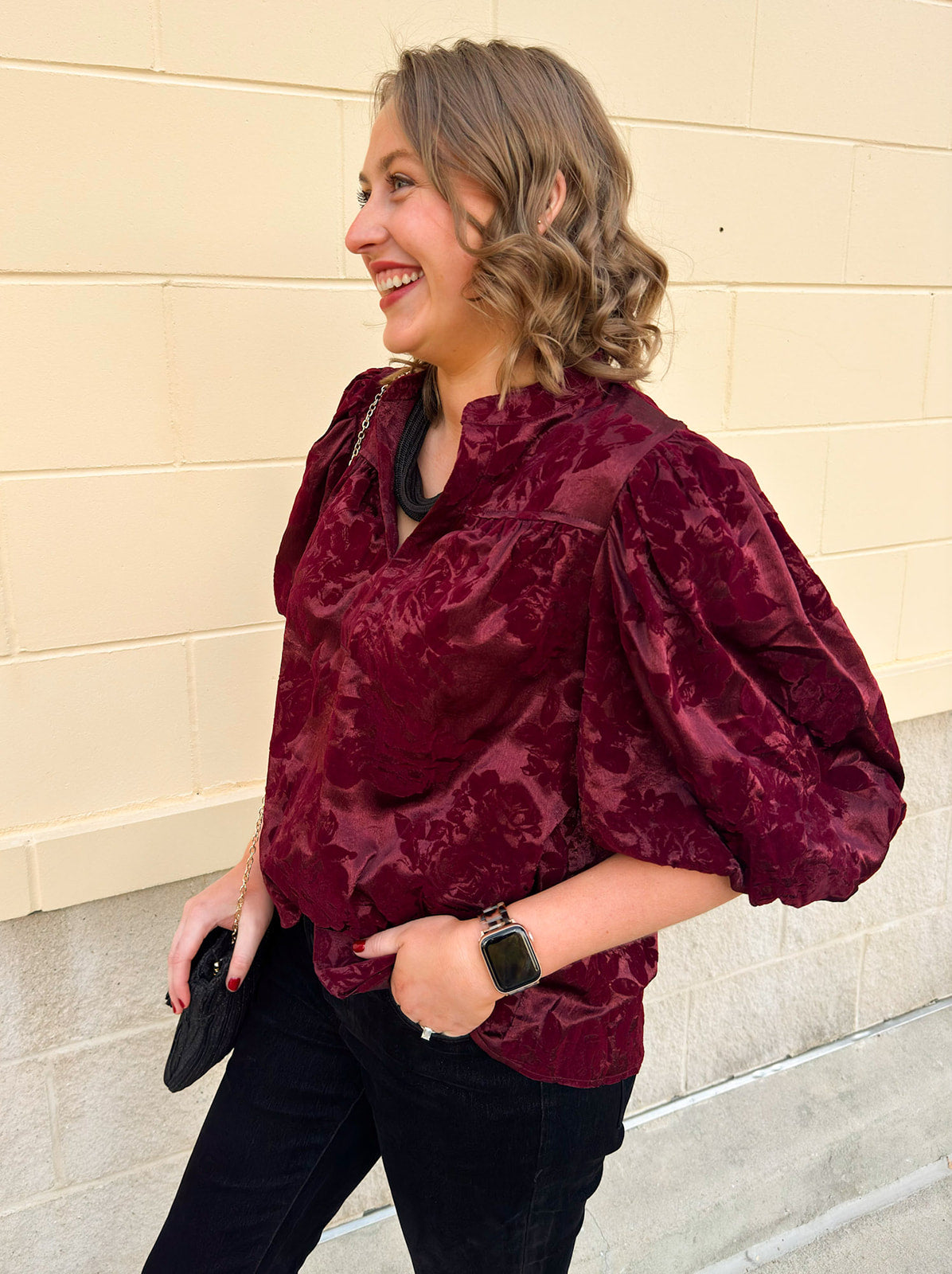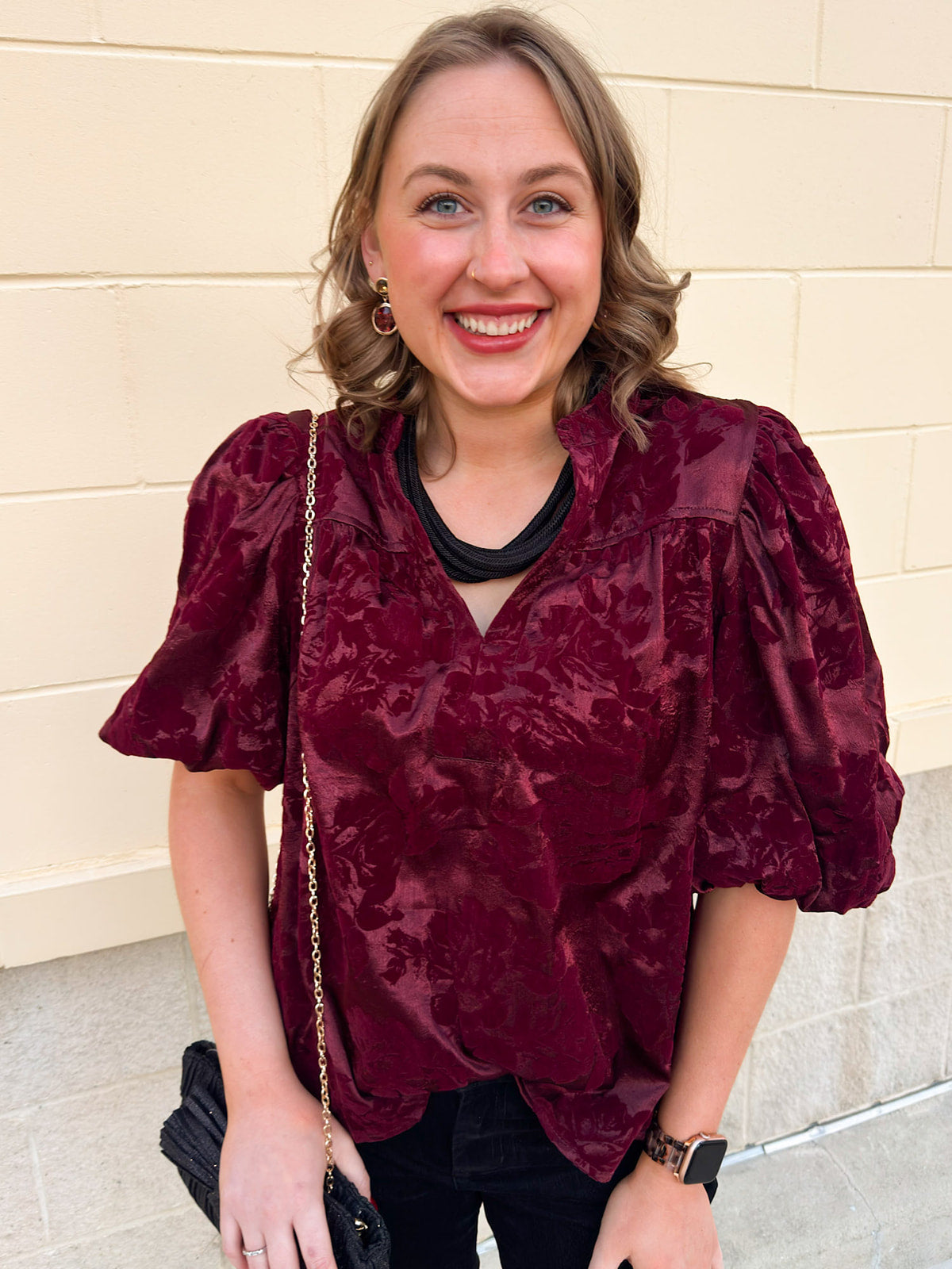 Add a touch of festive elegance to your holiday wardrobe with the Holly & Hearth Velvet Top. Crafted in a rich garnet velvet, the subtle tone-on-tone floral jacquard pattern brings dimension and sophistication to every look. Featuring a flattering split neckline and feminine puffed 2/3 sleeves, this top balances polished style with holiday charm, making it a standout for seasonal gatherings and festive celebrations.