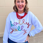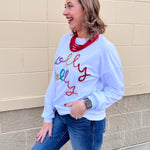 Need a festive sweatshirt that delivers instant holiday cheer and all the cozy comfort? The Holly Jolly Tinsel Crewneck Sweatshirt is your new December must-have. Made in a soft, winter-white cotton blend, this comfy long sleeve crewneck features “holly jolly” spelled out in bright, colorful tinsel-style lettering across the chest—fun, playful, and bursting with Christmas spirit. It’s the perfect blend of cozy and cute, giving you that cheerful pop without feeling overly loud. With its relaxed fit and plush interior, this sweatshirt is ideal for everything from holiday movie nights to cookie baking to strolling your favorite local markets.