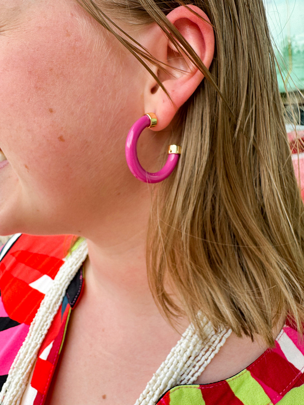 Elevate your style with our mini 1-inch Hoo Hoops Minis-Orchid! These lightweight and colorful earrings are sure to make a statement, adding a pop of personality to any outfit. Crafted in Nashville by women-owned fashion jewelry brand Hoo Hoops, these hoops are comfy enough for all-day wear. Hoo yeah!