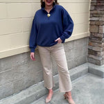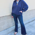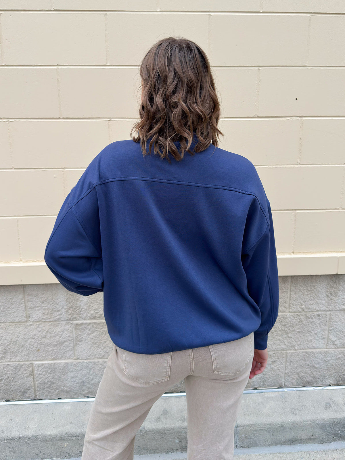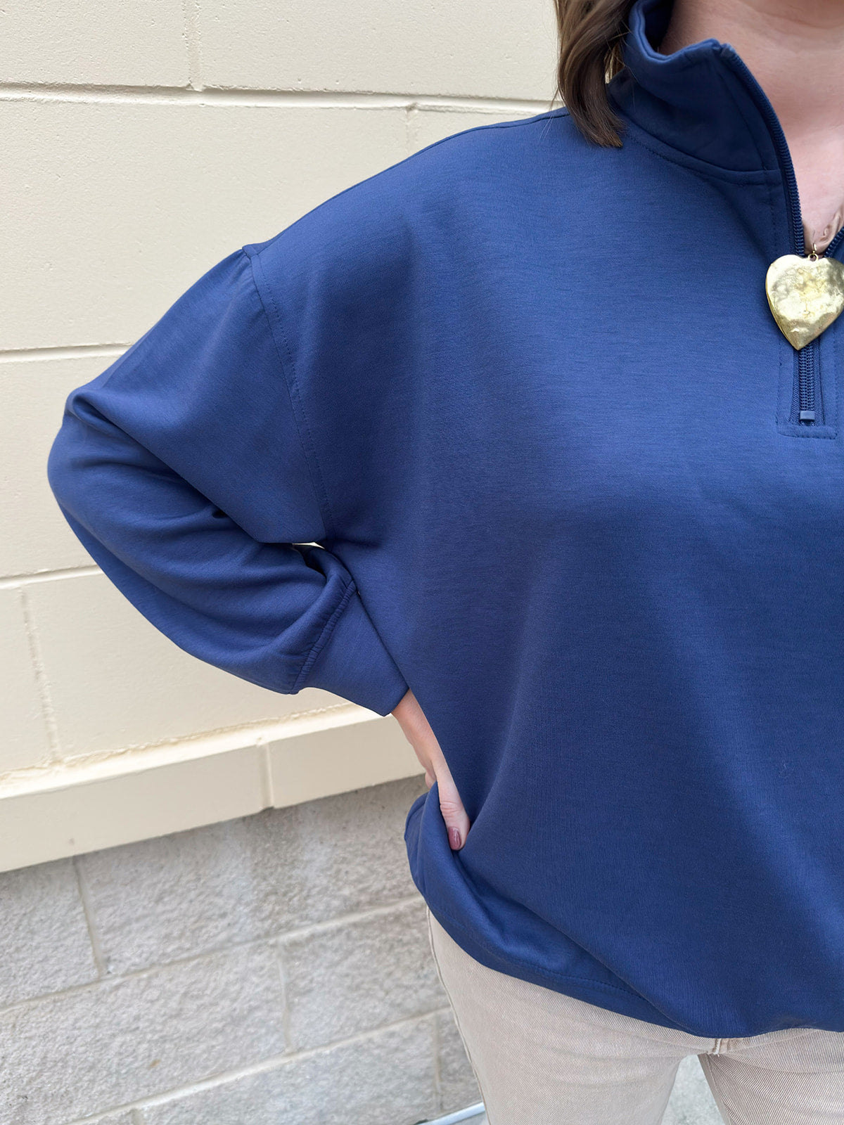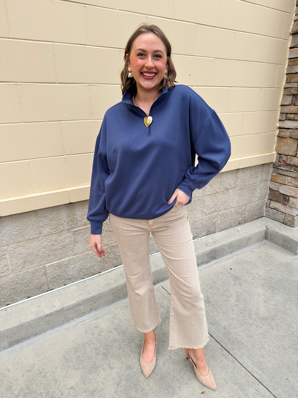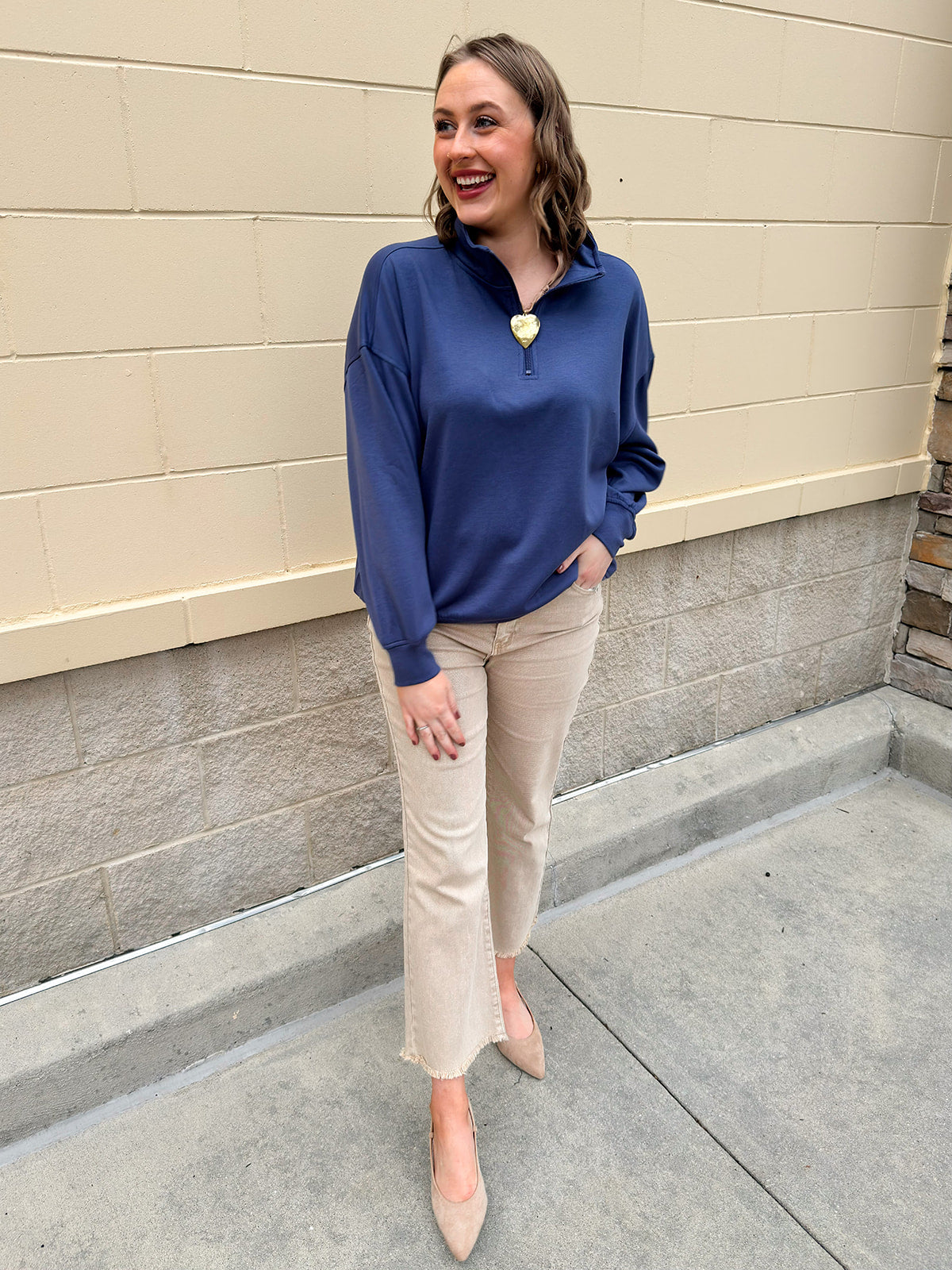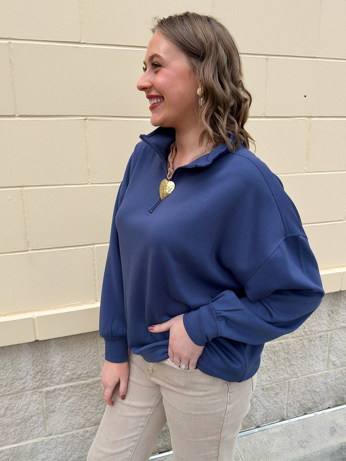 Casual comfort meets crisp color in the Indigo Ridge Half-Zip, your new favorite grab-and-go pullover. Designed in a rich indigo blue, this soft sweatshirt offers the same relaxed silhouette and polished details as our best-selling Jade Canyon—now in a versatile hue that pairs effortlessly with everything from denim to joggers. The half-zip neckline adds structure while keeping things easy and breathable. Whether you're layering up on a cool morning or lounging on a laid-back weekend, this piece brings just the right amount of cozy chic.