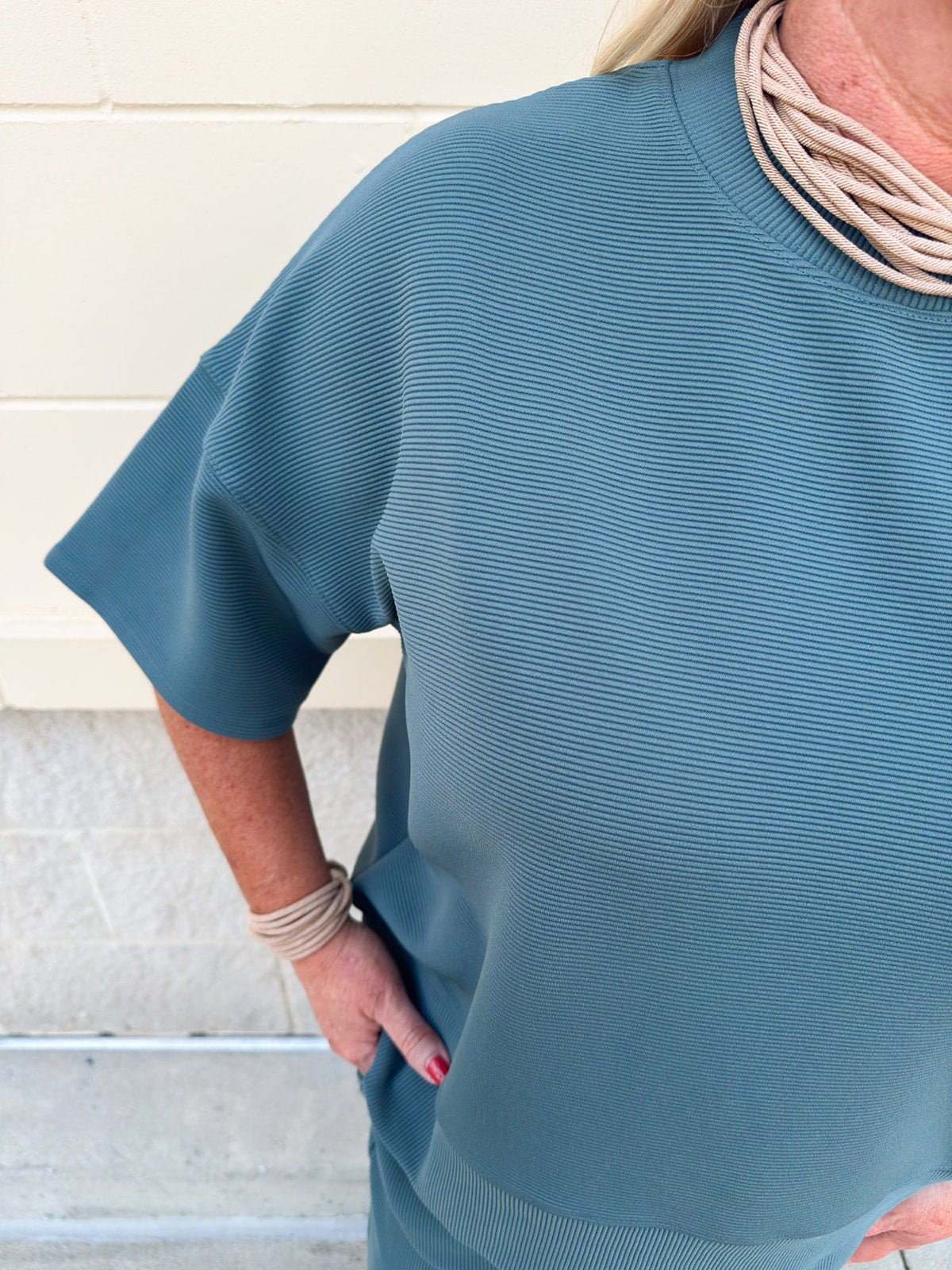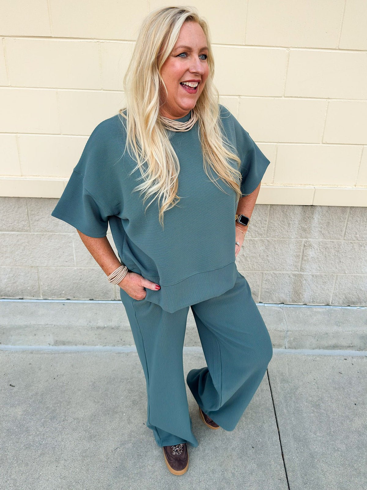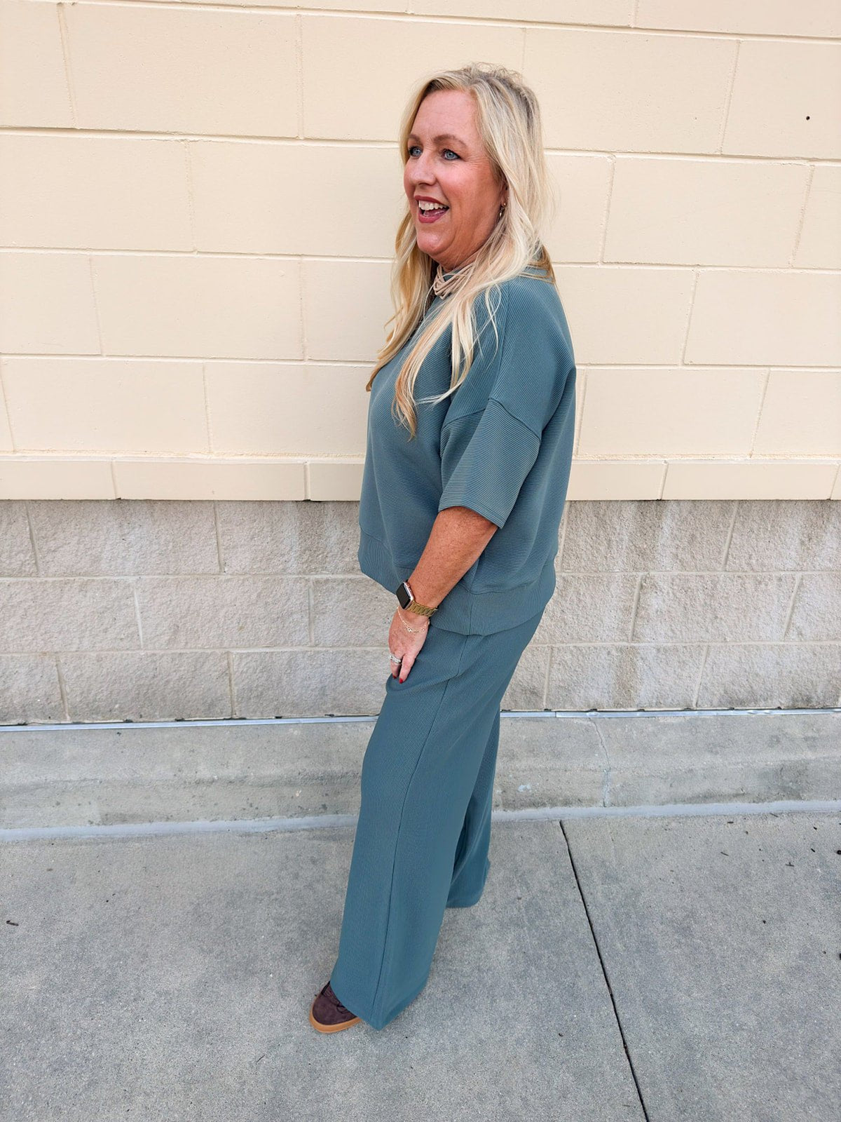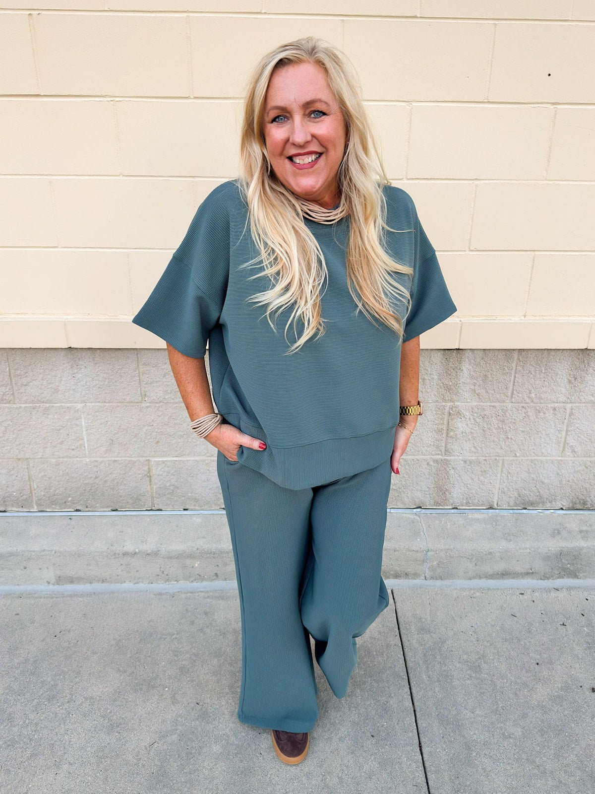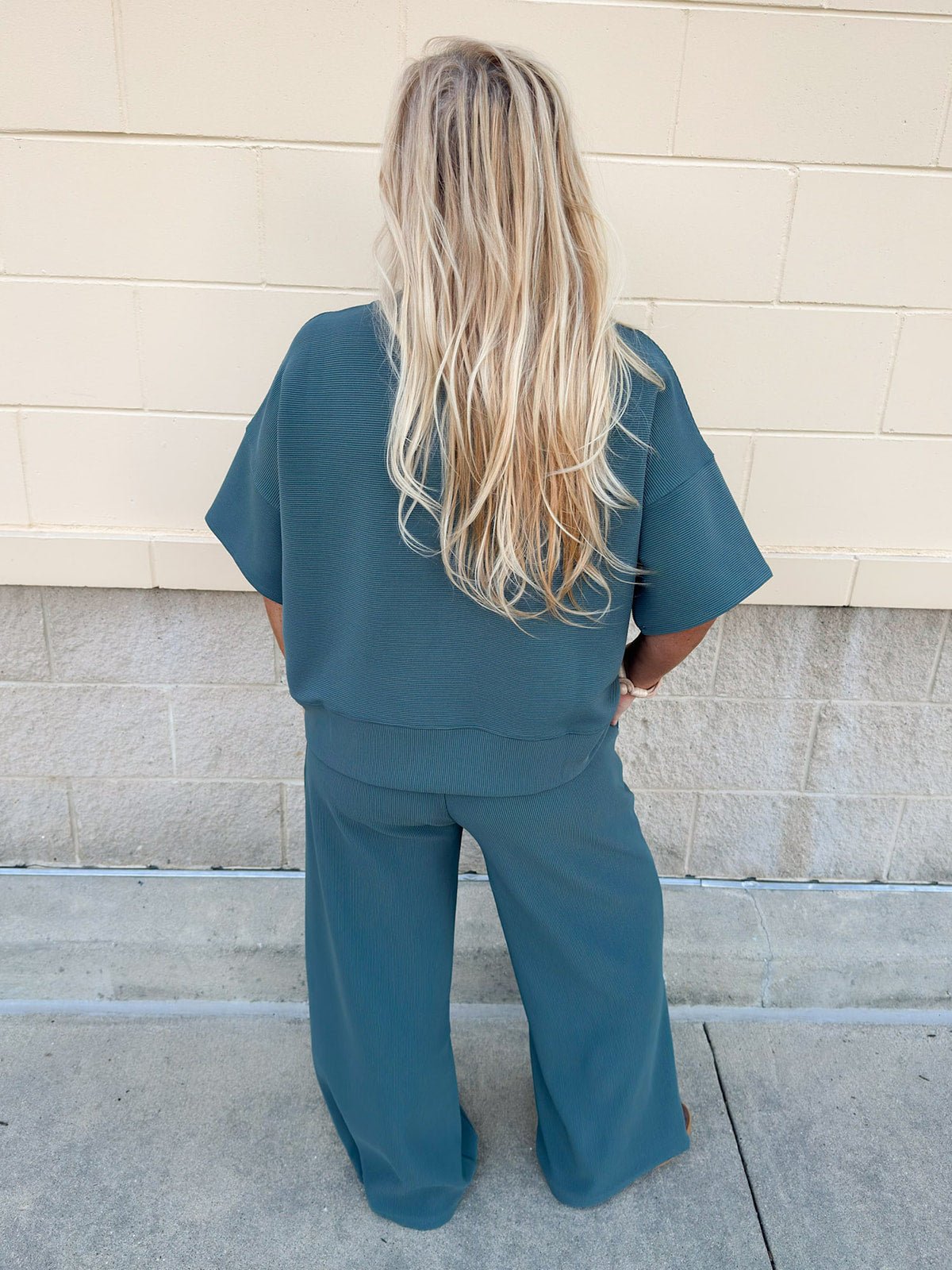 Looking for a comfy fall outfit that still feels effortlessly put-together? The Jewel Blue Ribbed Lounge Set delivers exactly that — a perfect mix of cozy comfort and everyday polish. Crafted in a soft ribbed knit, this two-piece set features a relaxed round-neck tee with wide short sleeves and matching pants designed for an easy, flattering fit. The rich jewel-tone blue gives it a touch of sophistication, making it just as cute for lounging at home as it is for casual days out.
