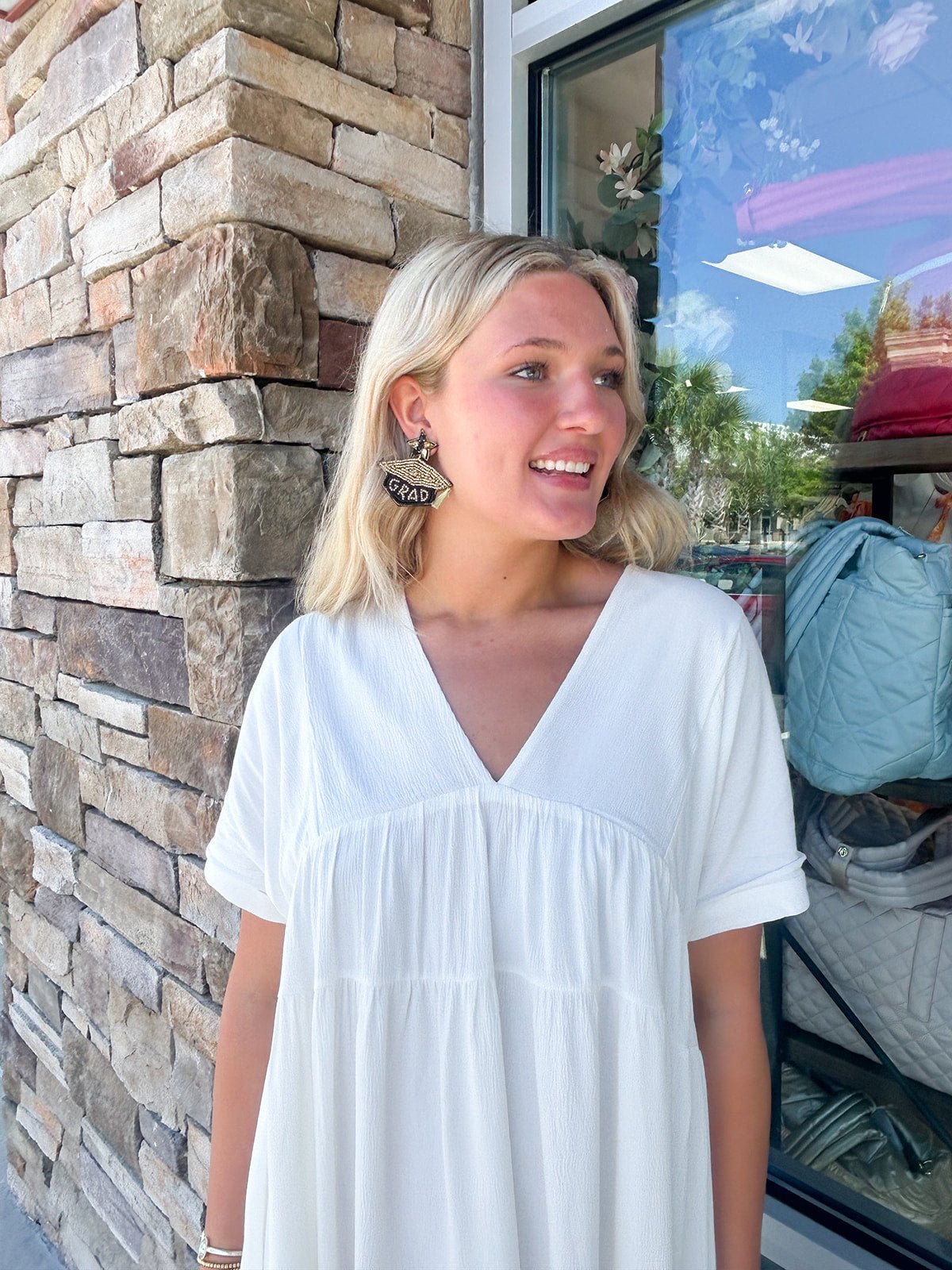 Celebrate your graduation in style with our stunning Jeweled Graduation Cap Beaded Drop Earrings. These exquisite earrings feature a graduation cap design adorned with shimmering beads, adding a touch of elegance to your outfit. Perfect for any graduate, these earrings are a beautiful way to commemorate your achievements!