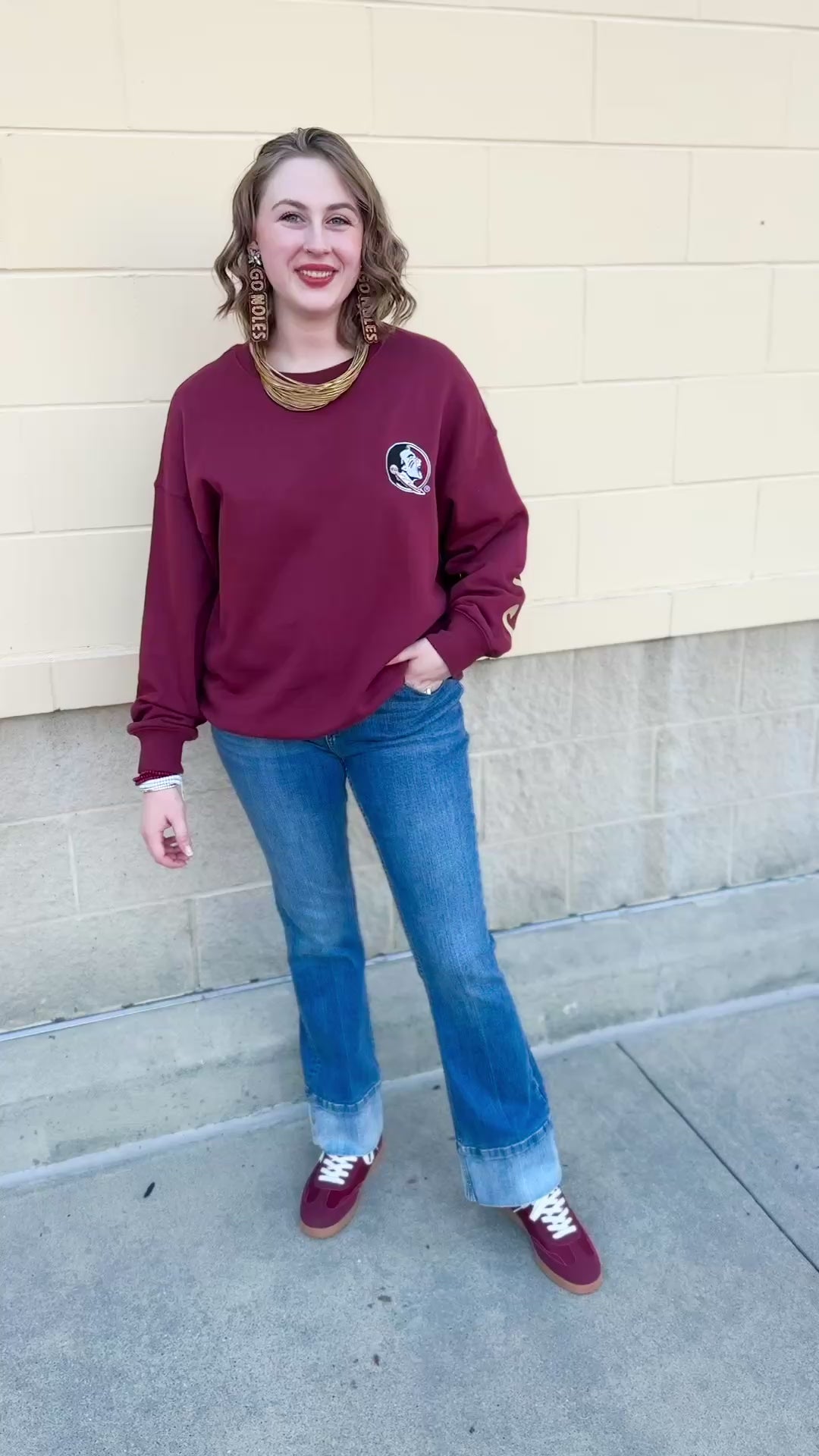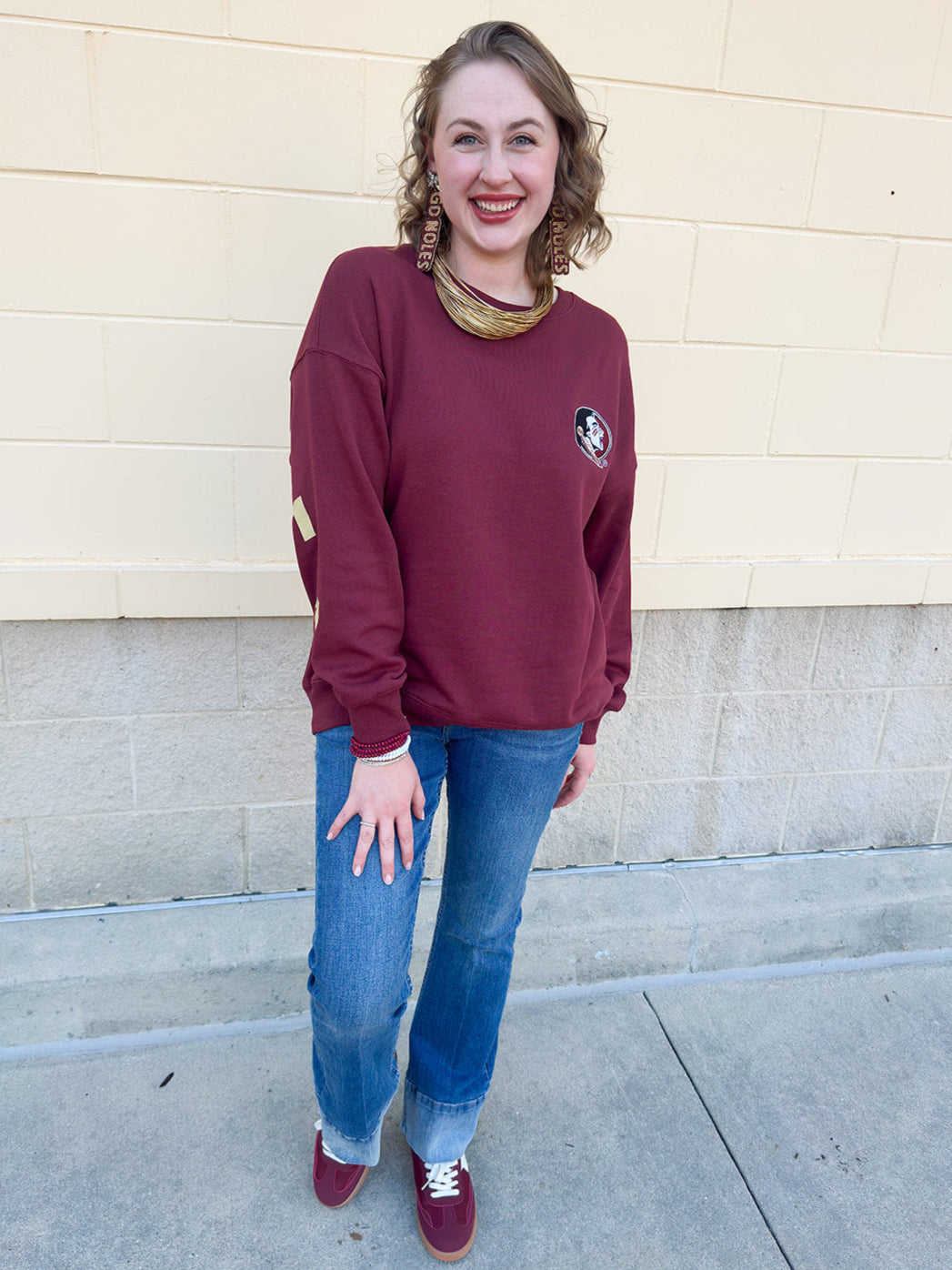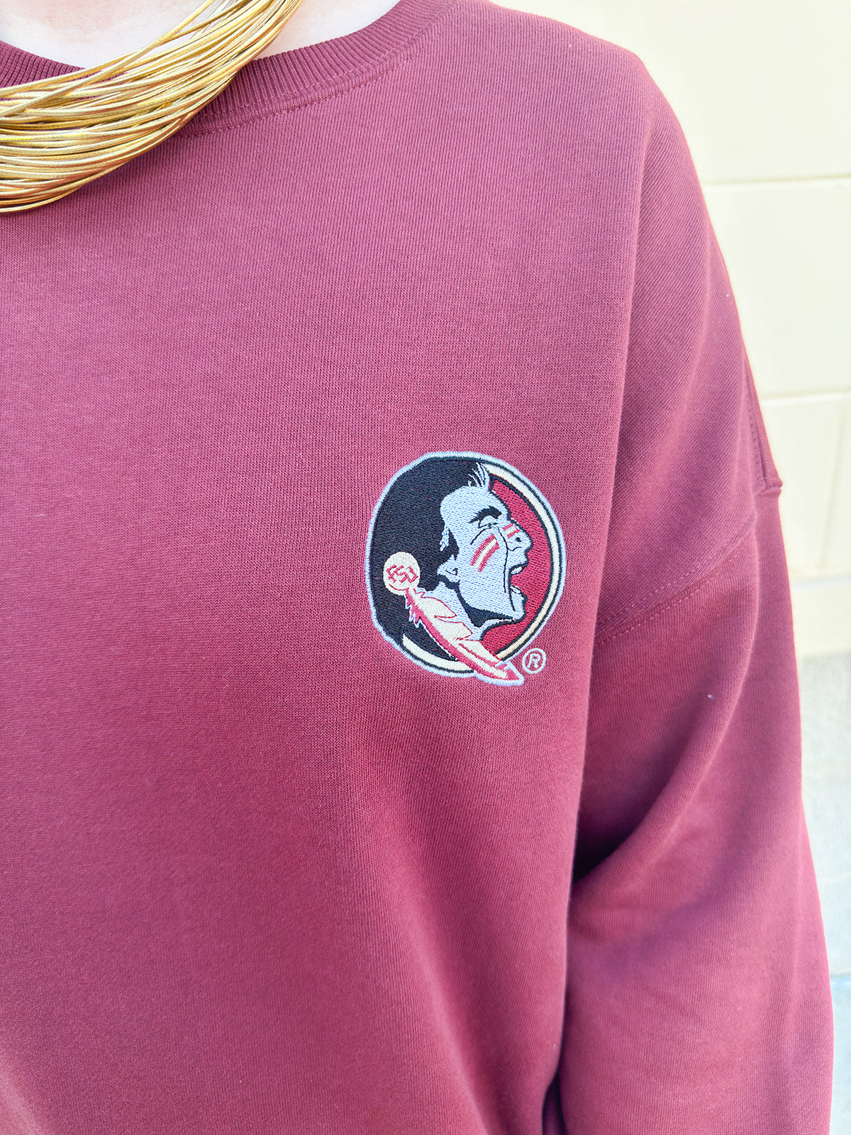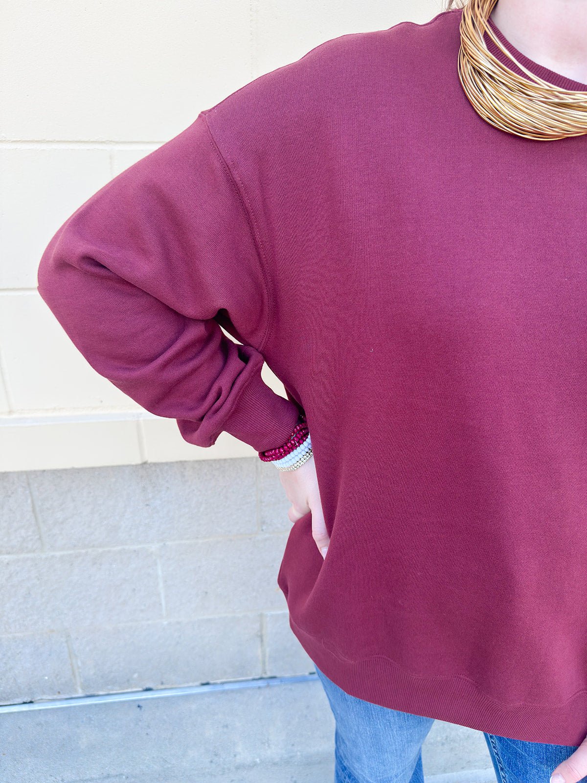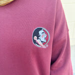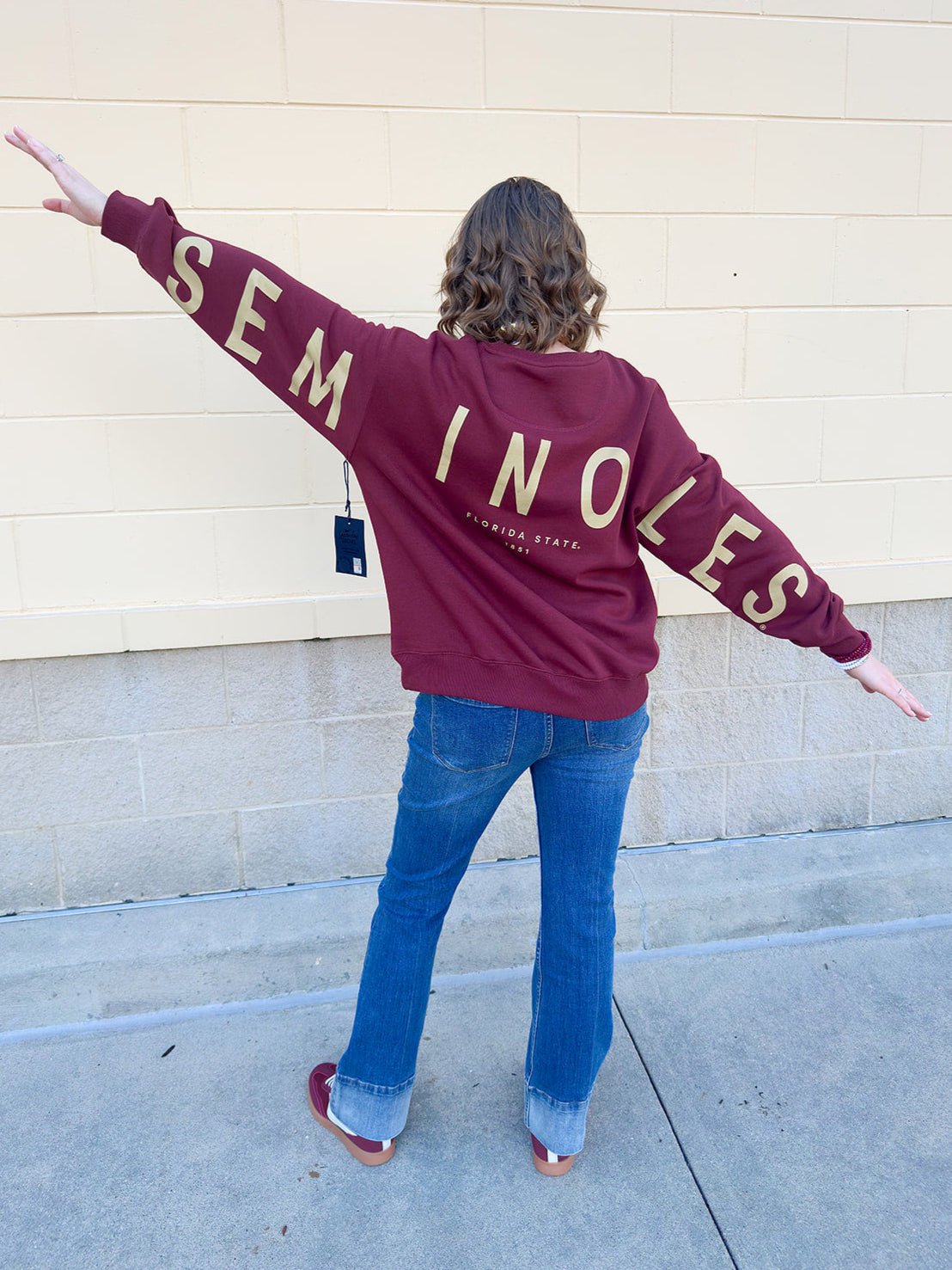 Looking for a way to show your Seminole spirit without sacrificing style? The Lantern Sleeve Crew in Garnet is the upgrade your game day and everyday wardrobe needs. We’ve taken the classic crewneck and given it a feminine twist with dramatic lantern sleeves that add just the right amount of flair. Designed in a rich garnet hue, this cozy crew features the iconic Seminole head on the front left chest and bold “Seminoles” lettering across the arms and back, making it a standout piece for fans who love a pretty-meets-sporty vibe.