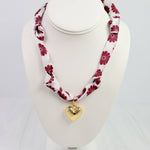 Add a playful yet polished touch to your gameday or everyday outfits with the Maroon Muse Scarf Necklace. This satin-feel scarf features a retro maroon-and-white floral print and is accented with a ribbed puff heart charm pendant for a chic, whimsical detail. Designed with two stylish knots and an adjustable tie-back closure, it offers a customizable fit and versatile styling options. Whether layered over a blouse, draped on a sweater, or tied as a statement accessory, this necklace brings boutique-ready charm to any look.