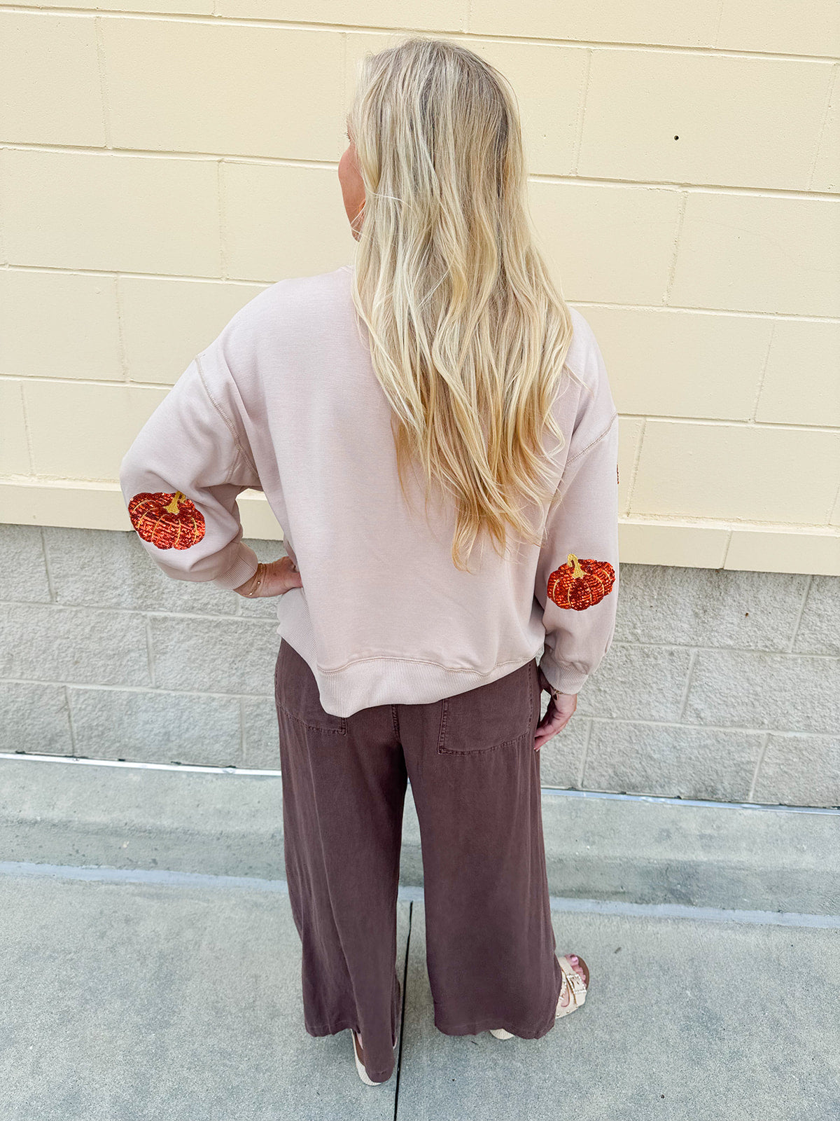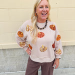 Embrace the cozy spirit of fall with the Mary Square Millie Traditional Pumpkins Sweatshirt. This cream-beige crewneck is sprinkled with festive charm, featuring sequined pumpkins in warm tones of orange, gold, and bronze. Each shimmering detail catches the light just right, adding a playful sparkle to your autumn wardrobe.