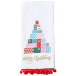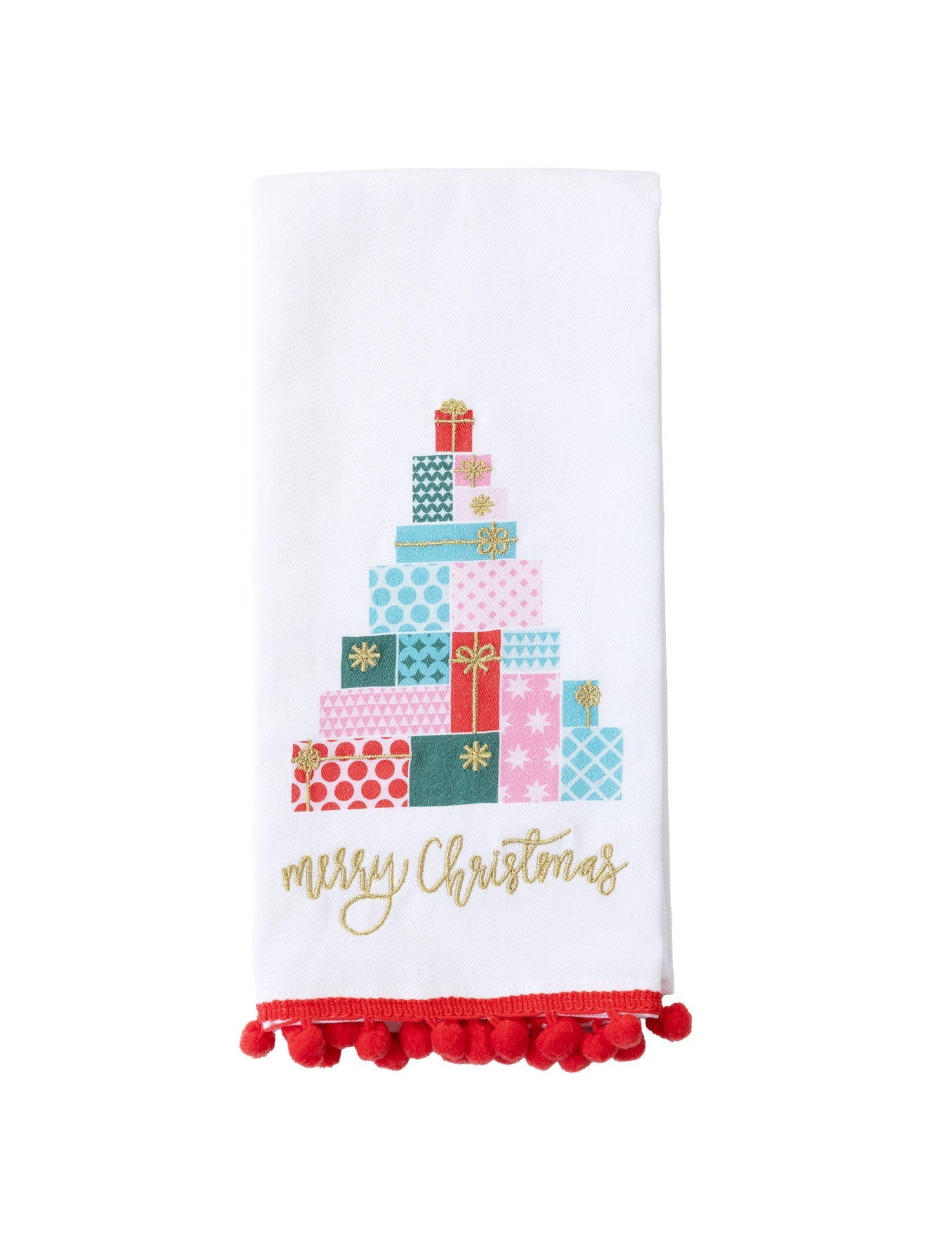 Introducing the Mary Square Present Tree Tea Towel! This festive kitchen towel features a unique, super cute graphic of a Christmas tree made entirely out of presents. It's the perfect addition to your holiday decor or a fun and quirky gift for your loved ones. Get it now and add some holiday cheer to your kitchen!