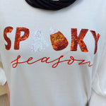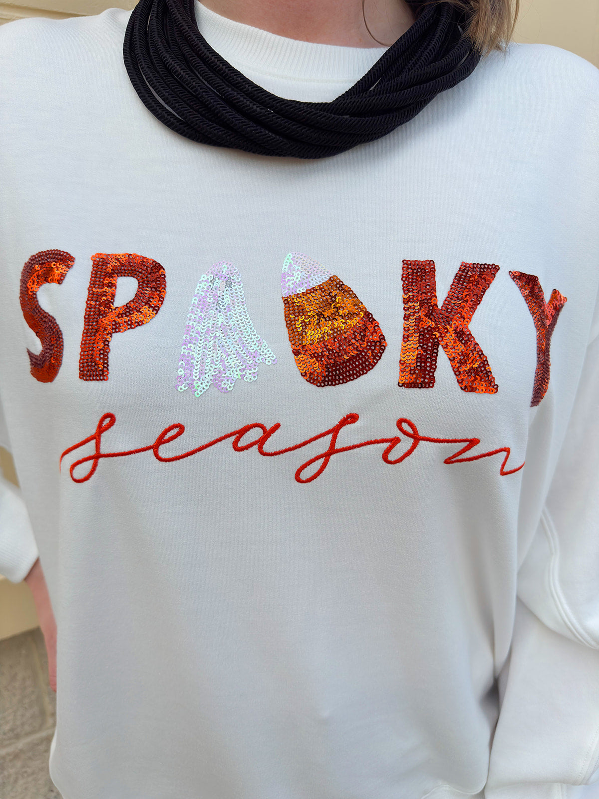 White crewneck sweatshirt with sequined “Spooky” and ghost/candy corn details