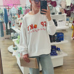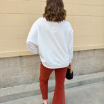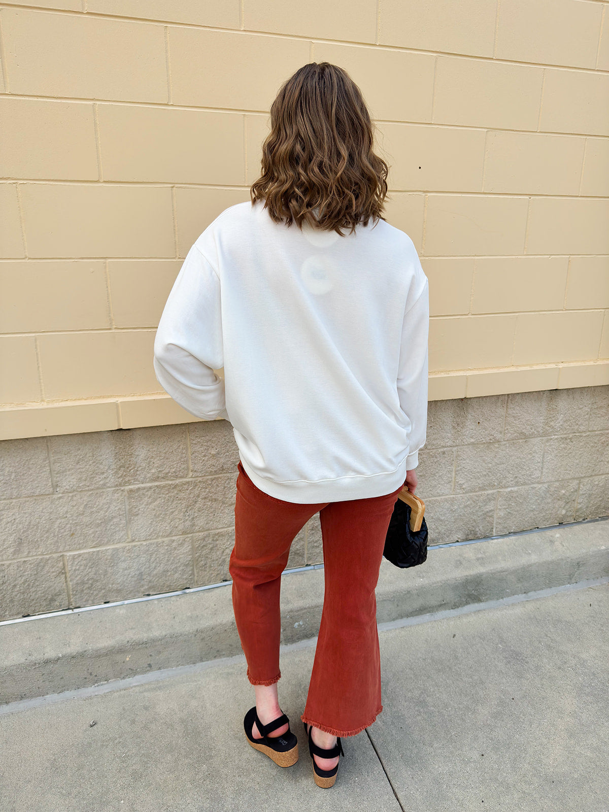 Celebrate the spooky season in style with the Mary Square Sarah Spooky Season Sweatshirt. This crisp white crewneck brings playful Halloween vibes with dazzling sequined lettering and festive details. The word “spooky” steals the show, featuring a ghost and candy corn as the “o’s,” while “season” is stitched in elegant embroidered script. The mix of textures—sparkling sequins and soft embroidery—adds a unique, elevated touch you’ll love to wear all October long.