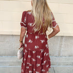 Brown tiered midi dress with cream floral embroidery