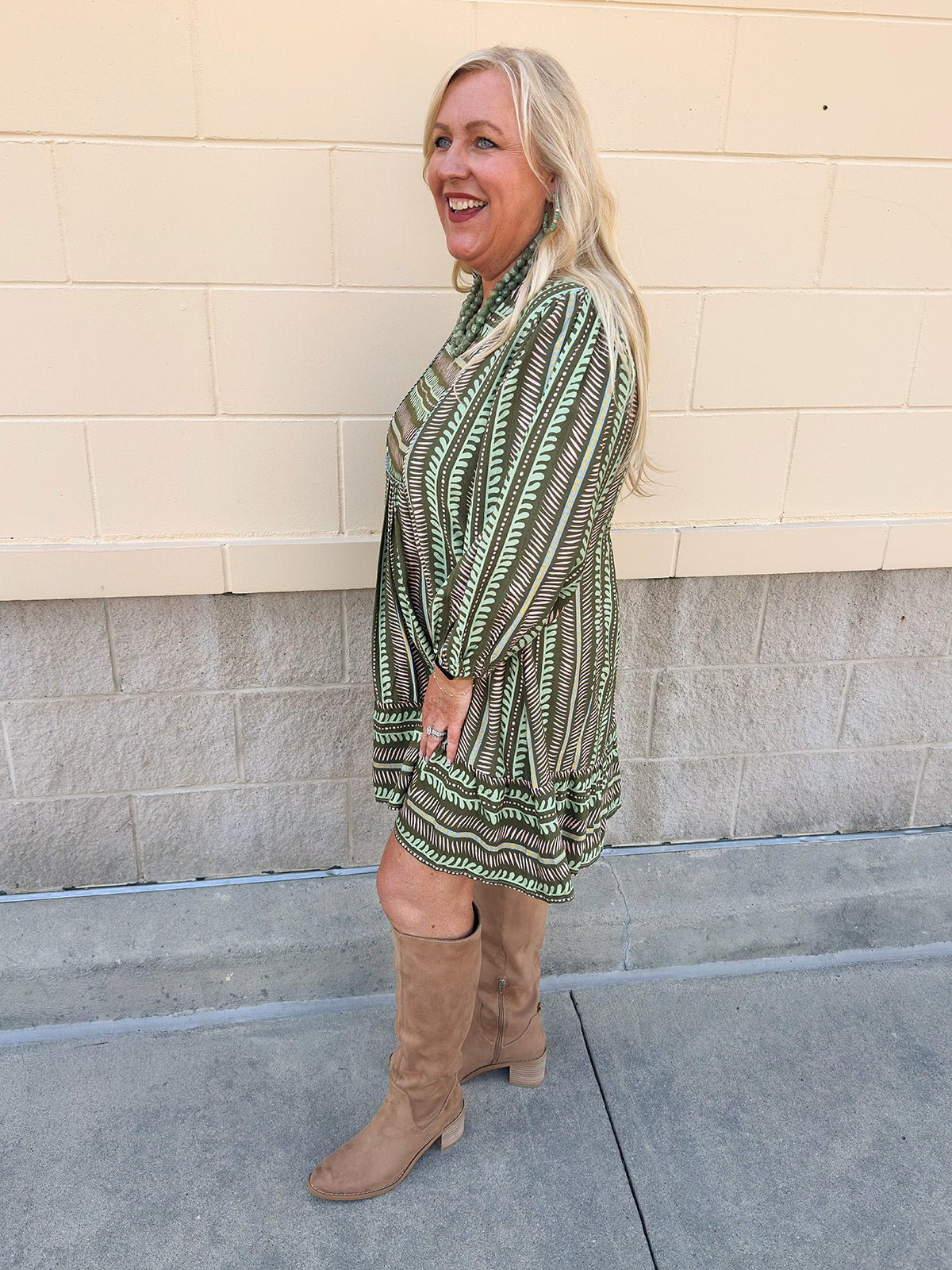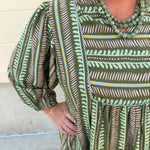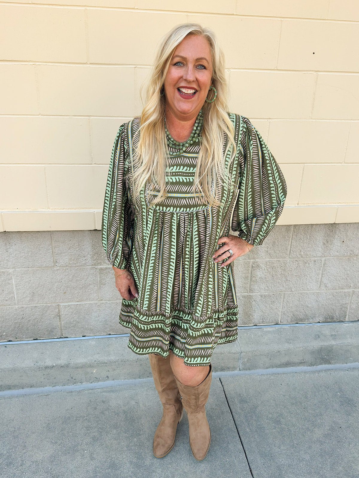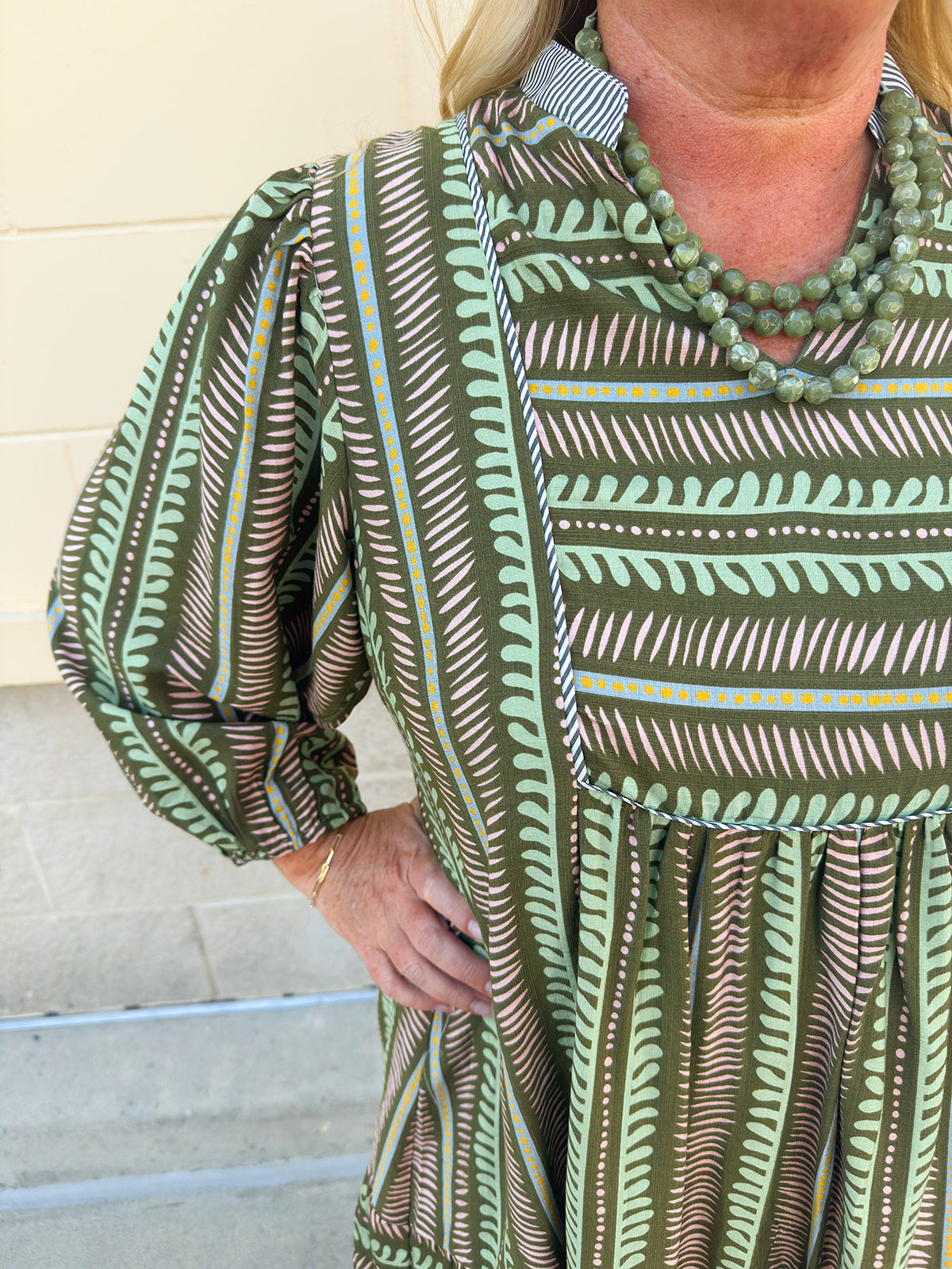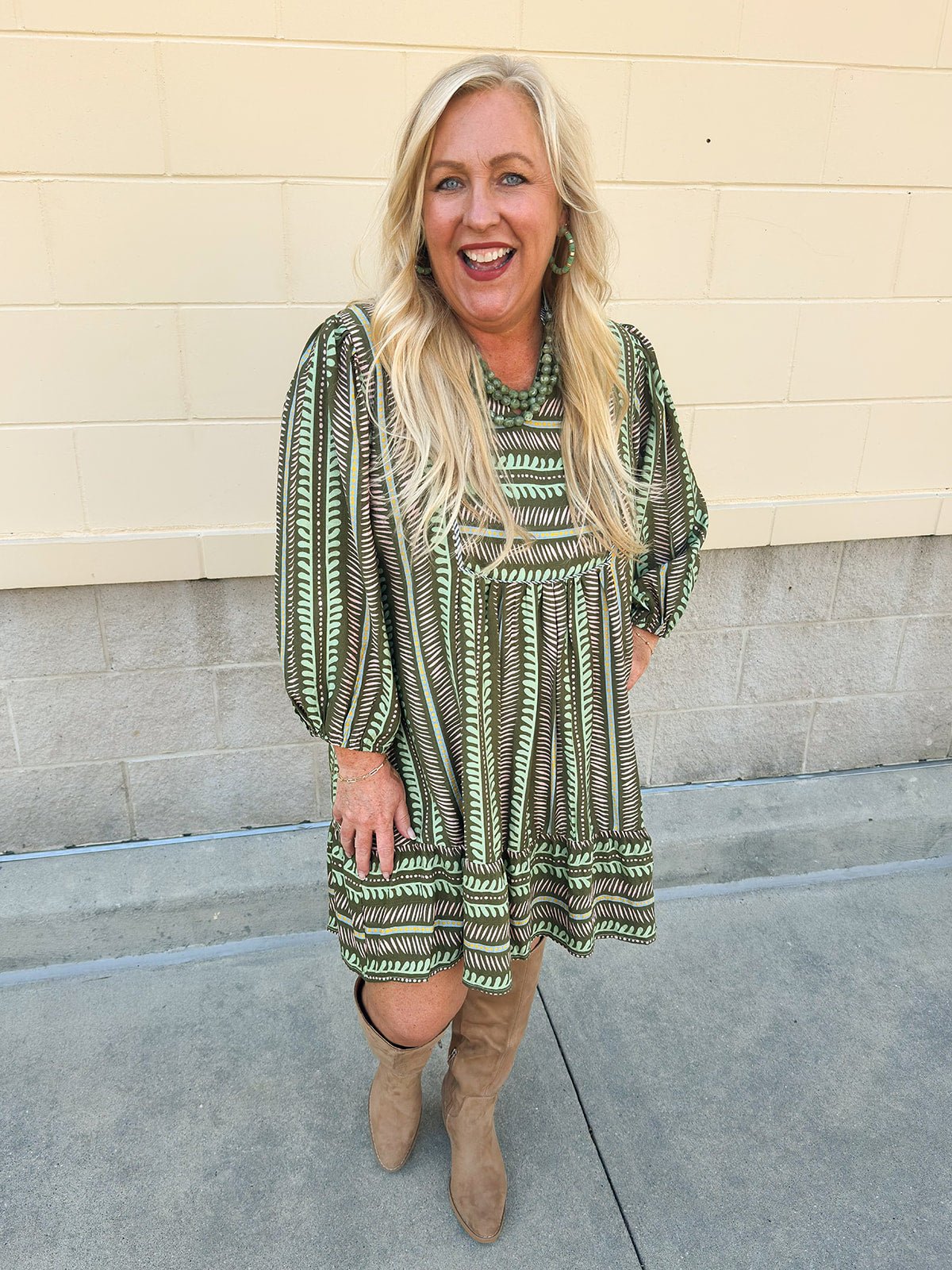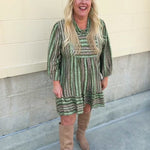Soft, earthy, and full of charm—the Meadow Mist Ruffle Mini Dress is the perfect blend of whimsy and polish. Set on an olive base, this mini is adorned with a subtle light pink and sage green design that feels naturally elegant. The ¾ length sleeves and flirty ruffled hem add just the right touch of movement, while light blue and white striped hems throughout give it a playful, unexpected twist. Finished with a slight V-neckline, this dress is made for golden hour strolls, garden parties, and everything in between.