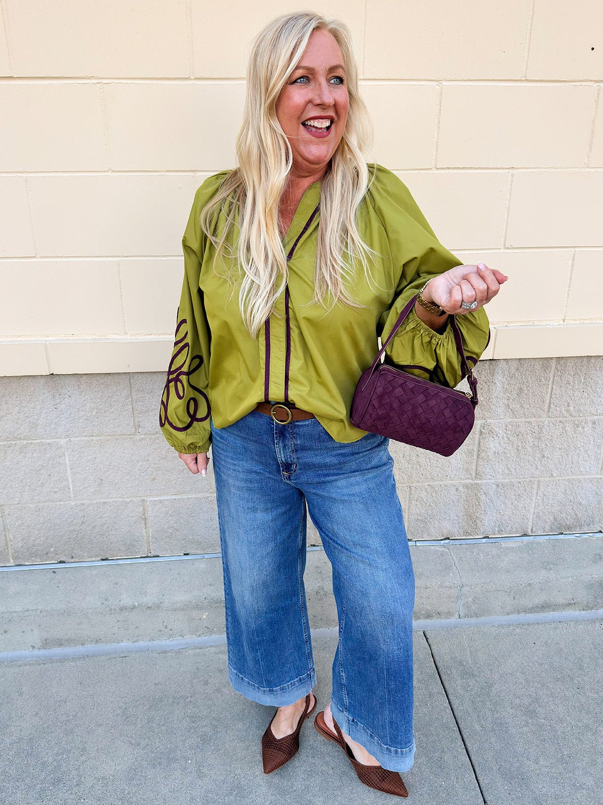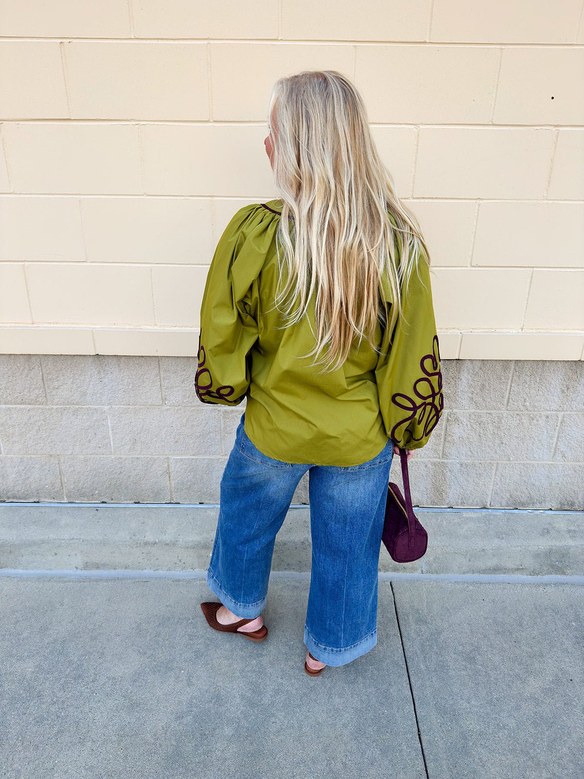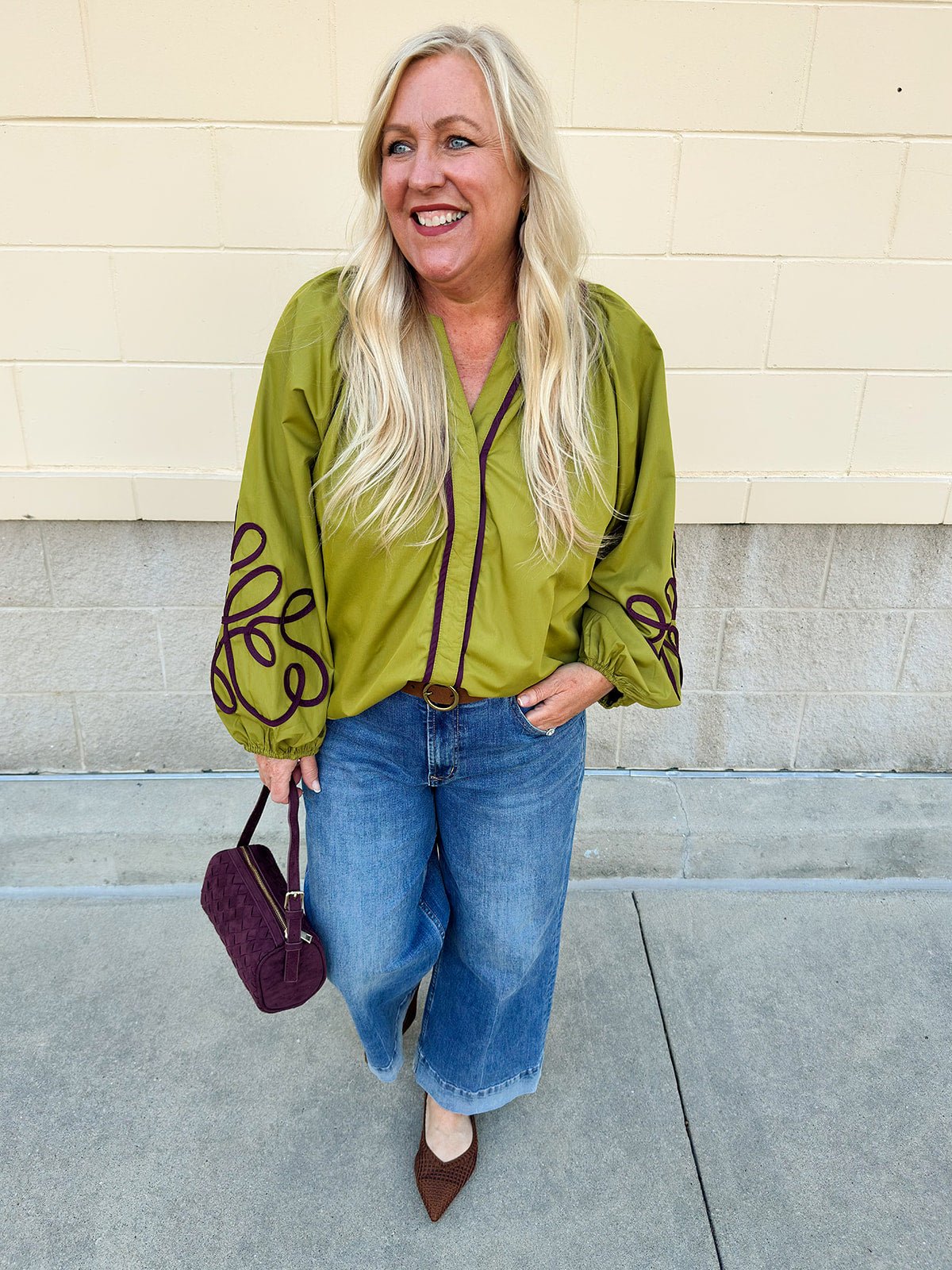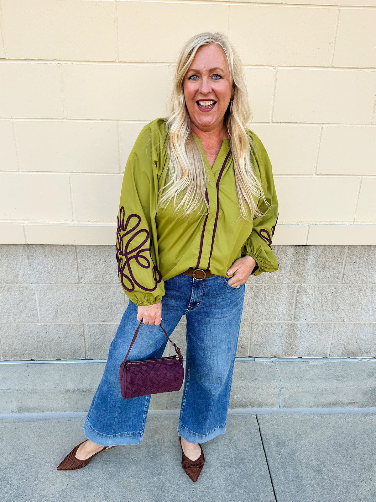 Crafted in a vibrant chartreuse shade, the blouse is elevated by rich garnet soutache embroidery—an unexpected color pairing that feels both artistic and sophisticated. Lightweight and versatile, it transitions seamlessly from day to night, pairing just as beautifully with dark denim for casual outings as it does with tailored trousers for an elevated look. A wearable work of art, this blouse is perfect for the woman who wants her wardrobe to feel unique, polished, and unforgettable.