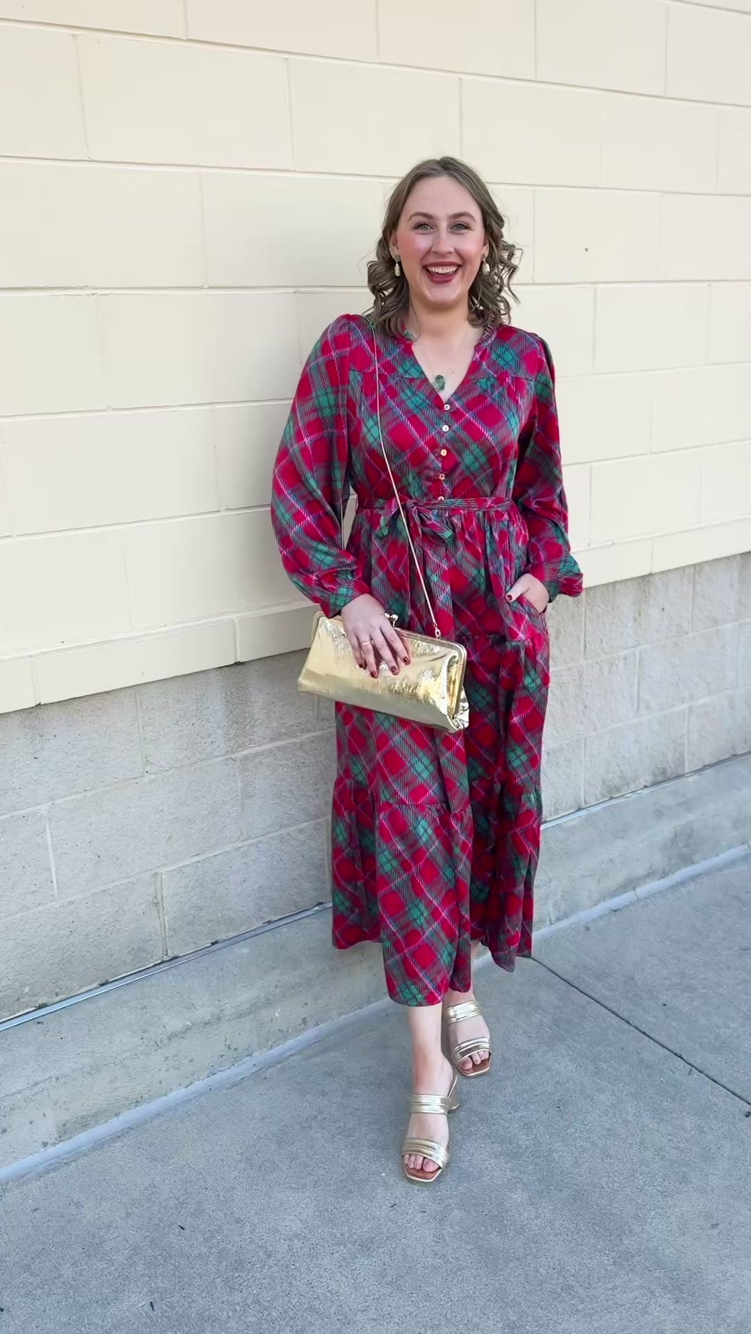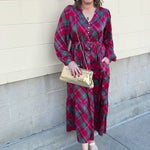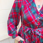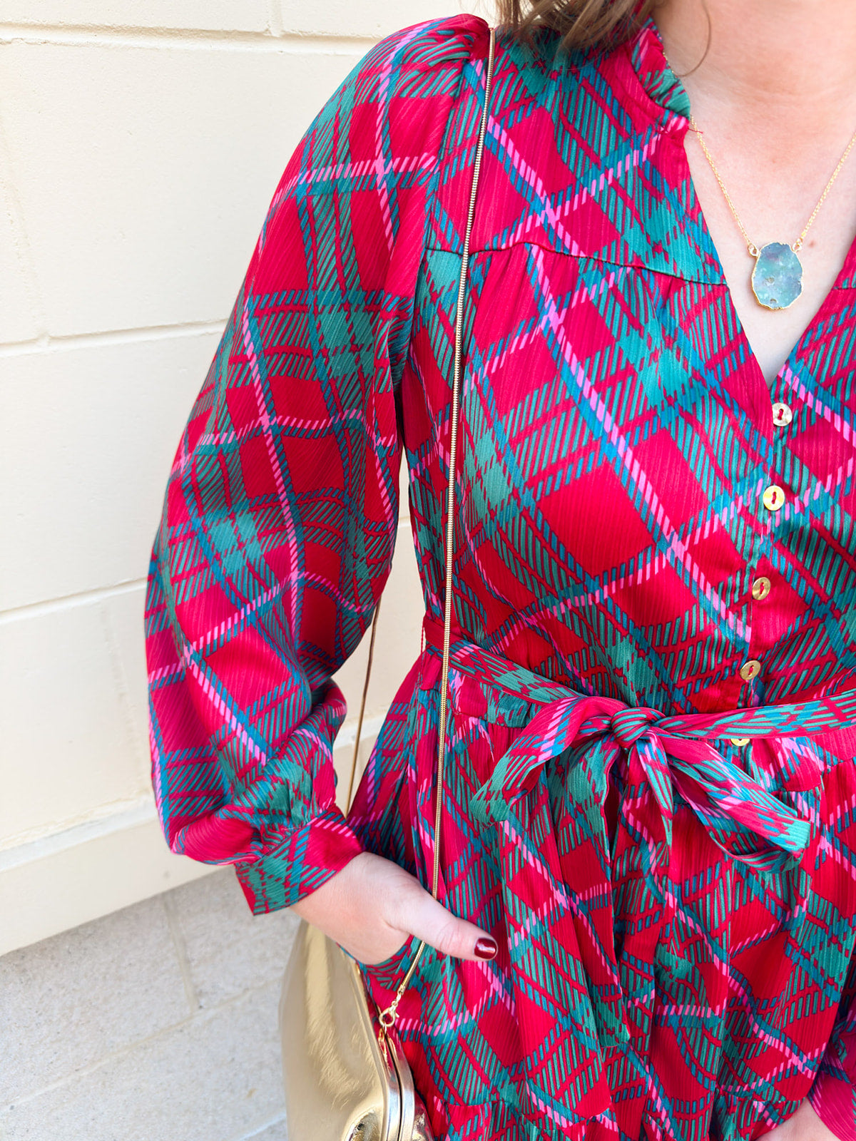 Step into the season with the Merritt Plaid Tiered Midi Dress—a perfect blend of classic charm and modern sophistication. Crafted in a festive pink, red, and green plaid pattern, this dress captures the spirit of the holidays with timeless elegance. The delicate ruffle split V-neckline adds a soft, feminine touch, while long sleeves with button cuffs bring a refined finish. Designed with a removable tie belt, you can easily cinch the waist for a figure-flattering silhouette or wear it loose for effortless comfort. The tiered midi skirt moves gracefully with every step, making it as versatile as it is beautiful.