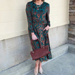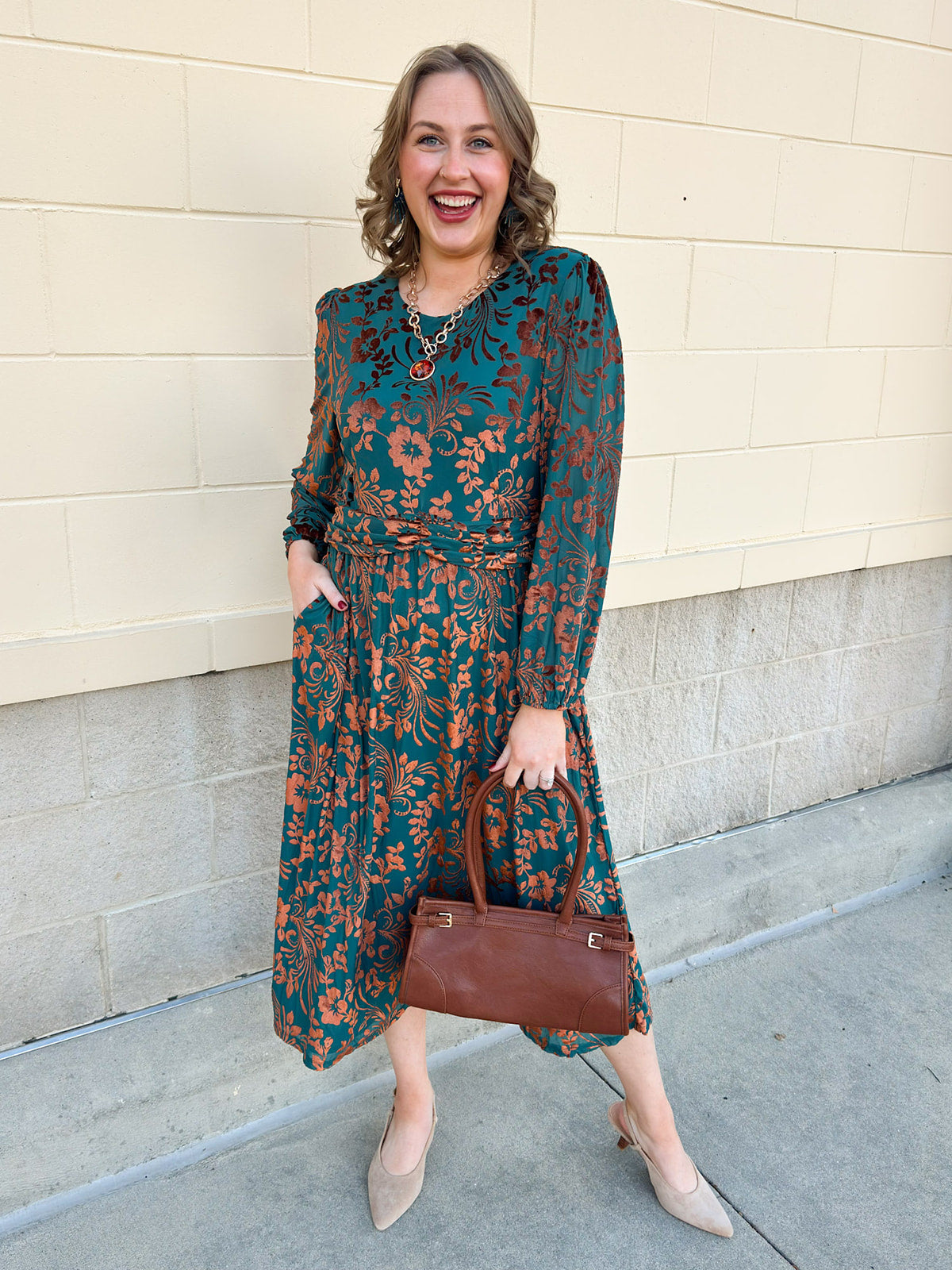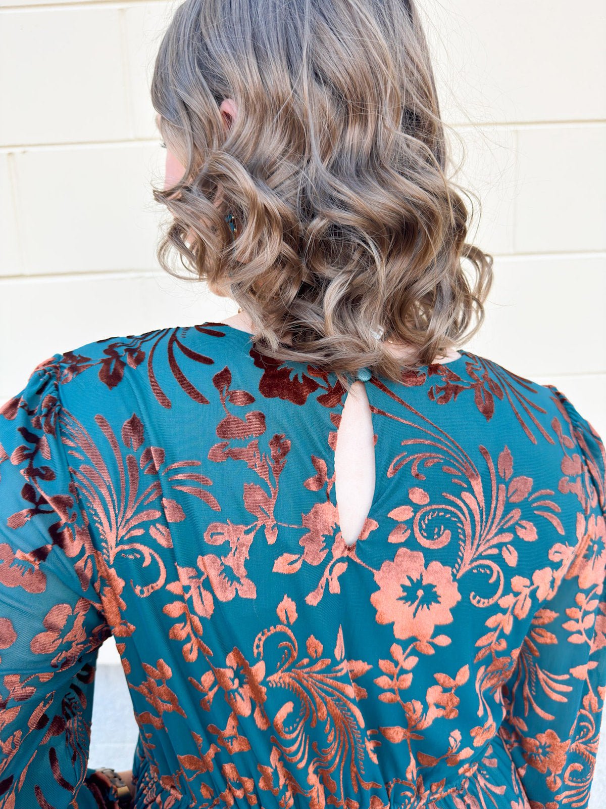 Searching for that one show-stopping dress for the holiday season? The Midnight Garden Velvet Jacquard Midi Dress brings just the right blend of luxury and elegance. Crafted in a rich dark teal hue with a shimmering gold velvet floral jacquard print, this dress captures the glow of winter nights and festive gatherings. The round neckline and long sleeves with elastic cuffs create a refined silhouette, while the draped waistline and subtle keyhole back detail add a graceful, feminine touch.