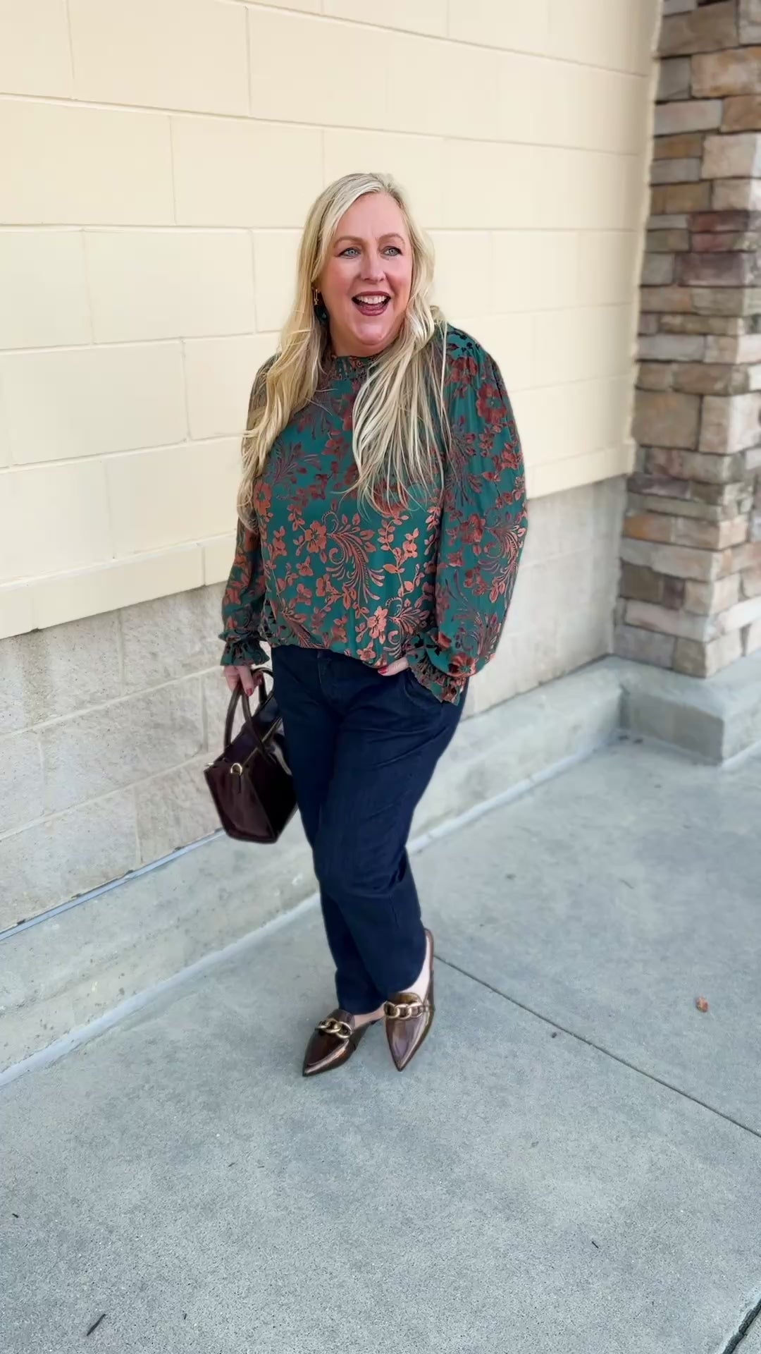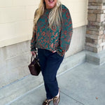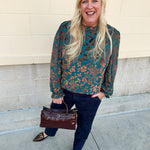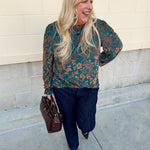 Need a statement top that feels festive yet timeless? The Midnight Garden Velvet Jacquard Top delivers all the luxe charm of the matching dress in a versatile silhouette made for any winter occasion. Designed in a deep dark teal with a golden velvet floral jacquard pattern, it shimmers beautifully under holiday lights. The round neckline and ruffled cuffs add a touch of feminine flair, while the subtle keyhole back keeps the look polished and sophisticated.