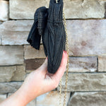 Ready to sparkle from brunch to evening soirées? The Midnight Glam Pleated Bow Clutch is where timeless elegance meets modern versatility. Designed in a shimmering black finish, this chic clutch features a beautifully pleated exterior and a statement bow accent that exudes feminine charm. The spacious interior provides room for all your essentials, while the detachable gold chain strap lets you switch effortlessly from a hands-free crossbody to a polished handheld clutch. Crafted from ethical materials, this bag offers luxe texture and sophistication without compromise—making it the perfect finishing touch for any holiday occasion.