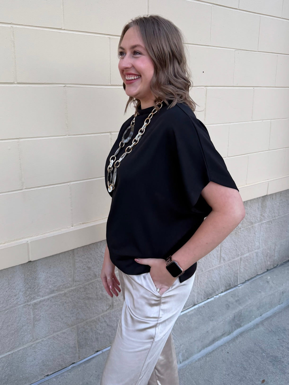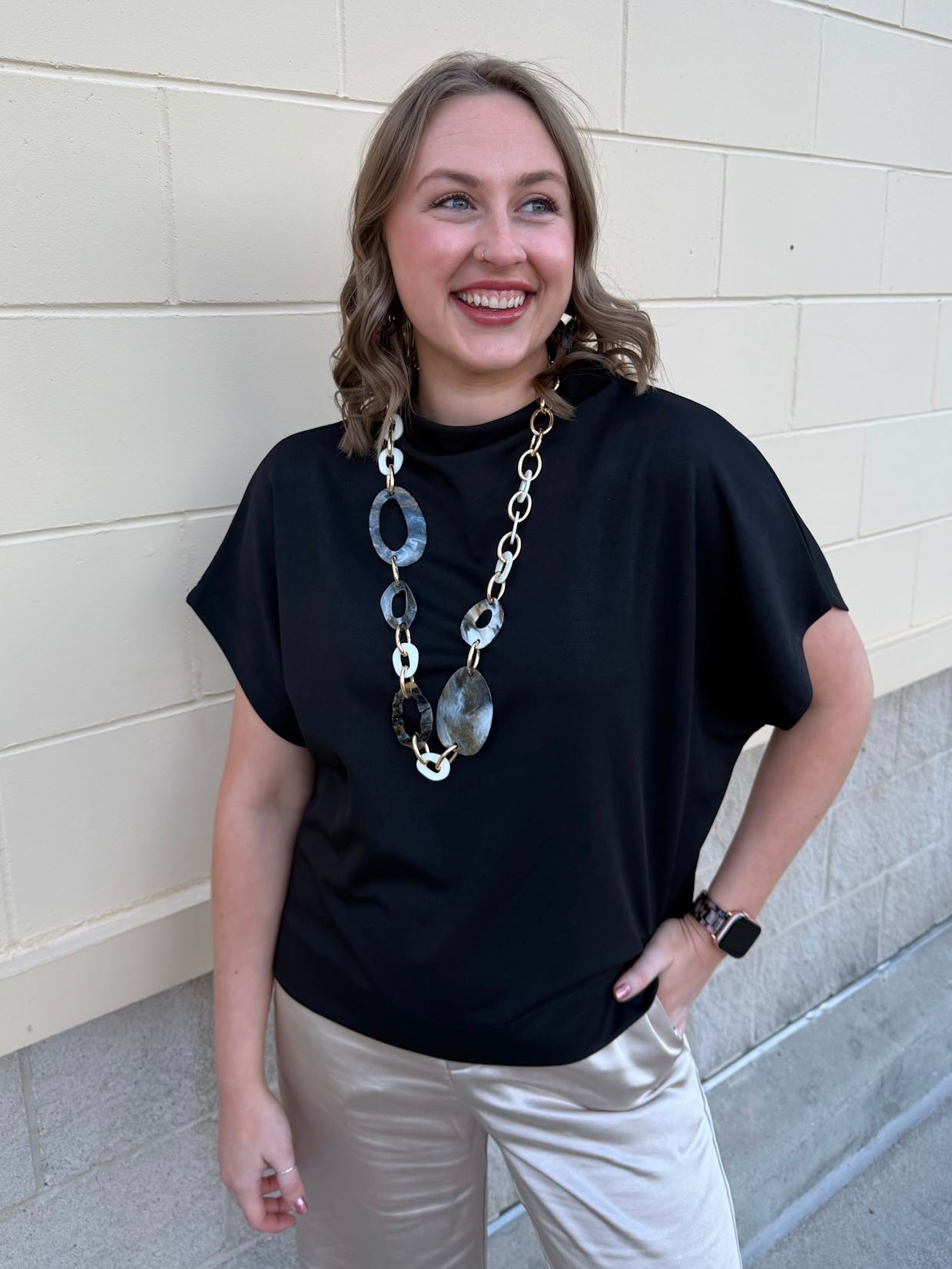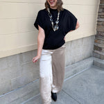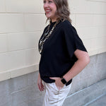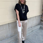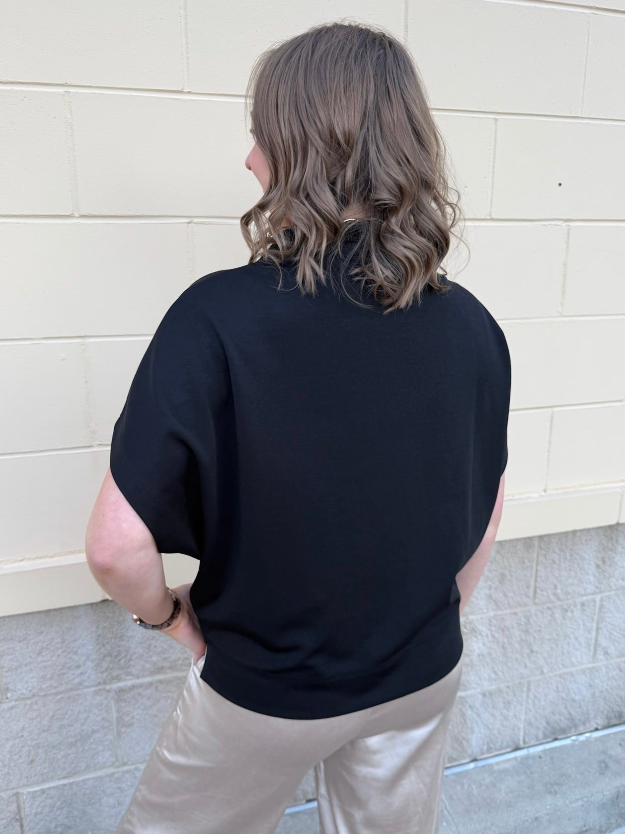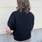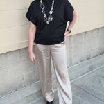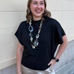 The Midnight Poise Dolman Top is modern, sleek, and effortlessly polished. Designed in a rich black woven fabric, this top features a softly draped neckline and relaxed dolman sleeves for a look that feels elevated yet easy.