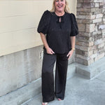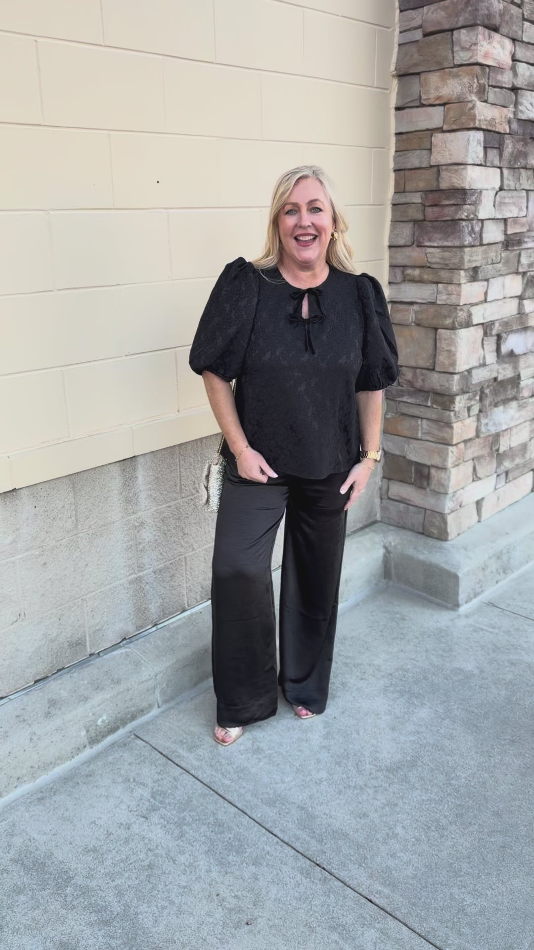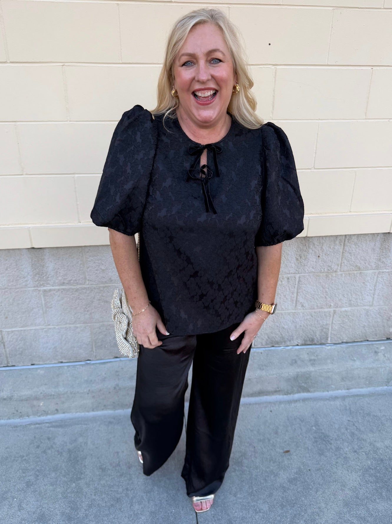 Elegant with a touch of drama, the Midnight Velvet Jacquard Blouse is designed to make every moment feel refined. Crafted from a subtle tonal black jacquard, it offers just the right amount of texture and sheen for a sophisticated finish. The statement puff short sleeves bring volume and femininity, while the delicate keyhole neckline with a soft velvet tie adds an irresistibly romantic touch.