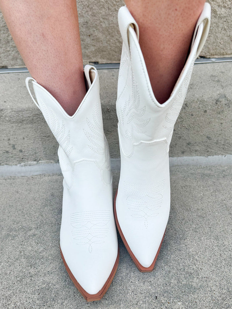 Looking for a shoe that blends everyday wearability with standout style? The Western Luxe Kinsey Booties are your answer. Crafted from premium vegan leather, these chic white booties bring sophistication with a touch of Western flair. The calf-height silhouette makes them a versatile choice for year-round styling, while the delicate stitched embroidery adds just the right amount of detail to elevate any look. Whether you’re dressing up a flowy dress, pairing them with a sleek midi skirt, or giving your denim a break, these booties effortlessly pull together your outfit with confidence and charm. Durable, stylish, and refined, they’ll be your new go-to for creating fashion-forward looks that still feel timeless.