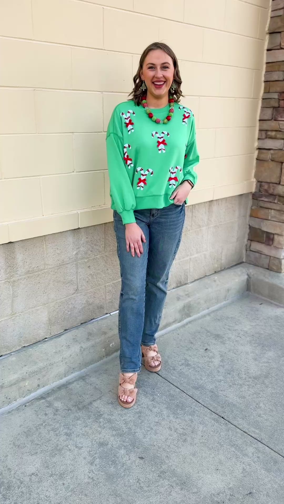 Looking for a cozy holiday sweatshirt that’s festive, comfy, and effortlessly cute? The Millie Candy Canes Sweatshirt delivers all the cheerful charm of the season in a soft, relaxed silhouette you’ll want to wear on repeat. Crafted in a rich holiday green, this long-sleeve crewneck features sparkling sequined candy canes wrapped in a bow—bringing a playful, elevated pop of Christmas sparkle to your winter wardrobe.