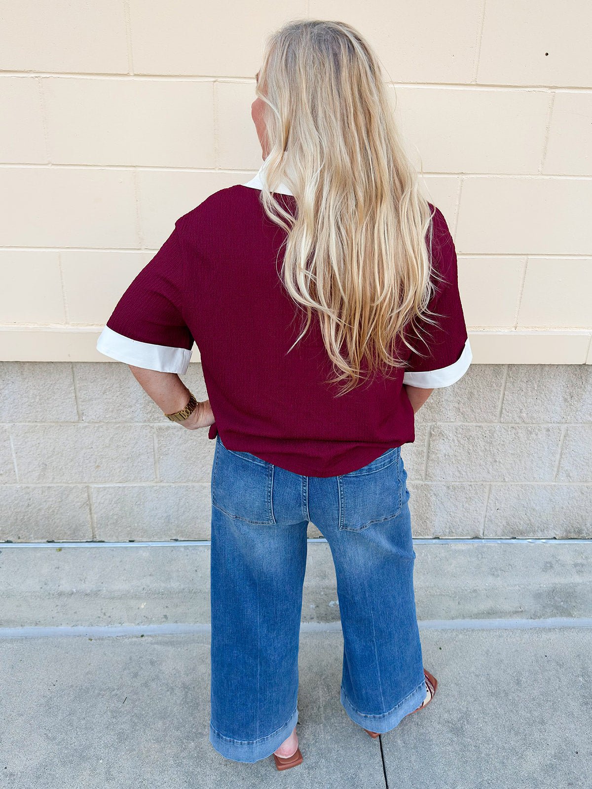 The short 2/3 sleeves are finished with contrast white tape at the cuffs, while the neckline and collar echo the same detail for a clean, tailored touch. In a rich burgundy hue with bright contrast, this piece strikes the perfect balance of sporty sophistication and laid-back charm. Lightweight and easy to style, it pairs seamlessly with denim for weekends, trousers for the office, or layered under a blazer for a sharp yet casual look.