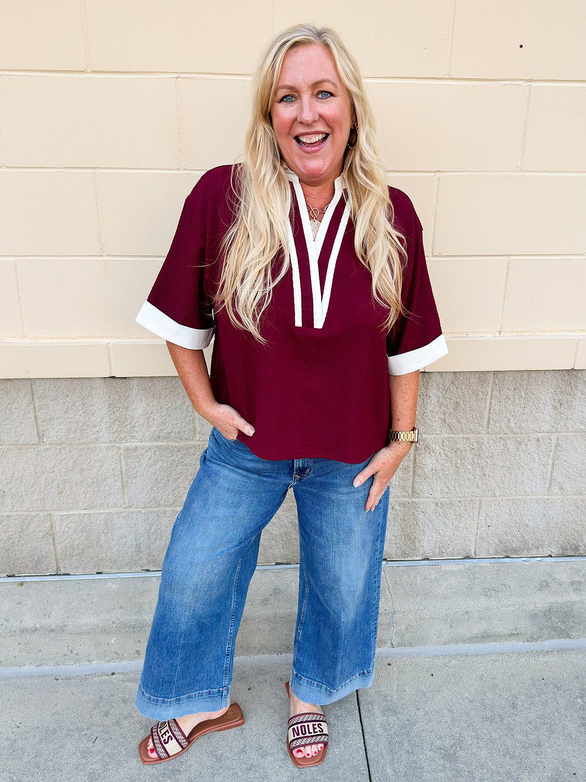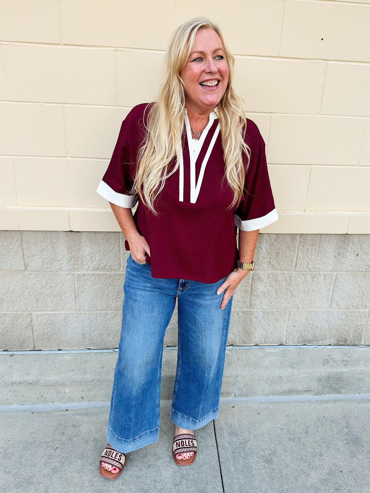 Looking for a top that blends casual ease with crisp detail? The Monaco Contrast V-Neck Top in Burgundy is a versatile staple designed to bring effortless polish to your everyday wardrobe. With its relaxed boxy fit and flattering V-neckline, it offers a modern silhouette that’s comfortable yet chic.