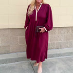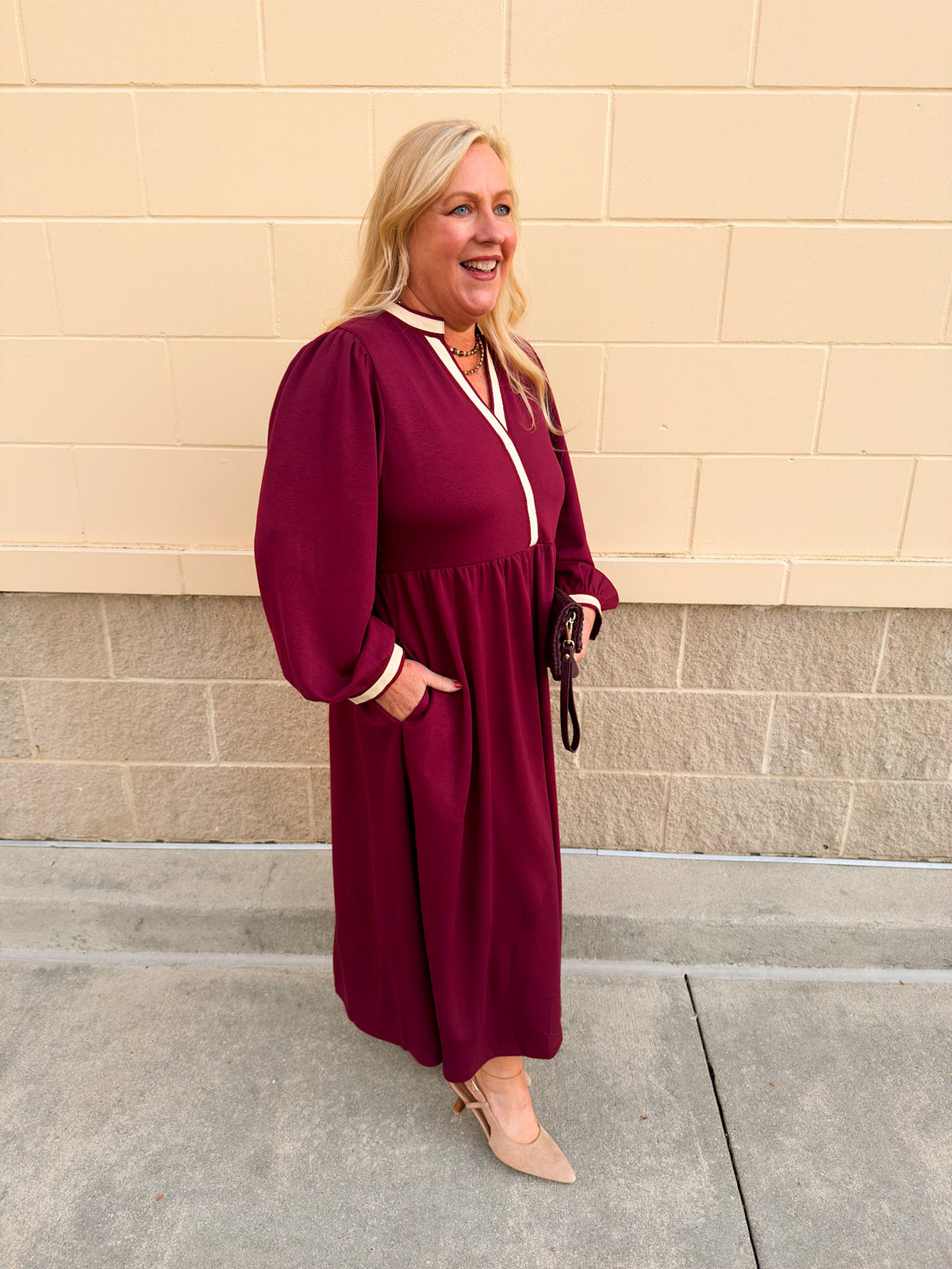Looking for that effortlessly elegant dress that feels festive yet timeless? The Mulberry Manor Contrast Midi Dress brings all the polish of the season in one stunning piece. Crafted in a deep garnet hue with soft cream contrast detailing along the collar and neckline, this dress blends classic charm with a modern silhouette. The long puff sleeves and midi length give it a romantic, feminine touch, while the hidden side pockets add everyday ease.