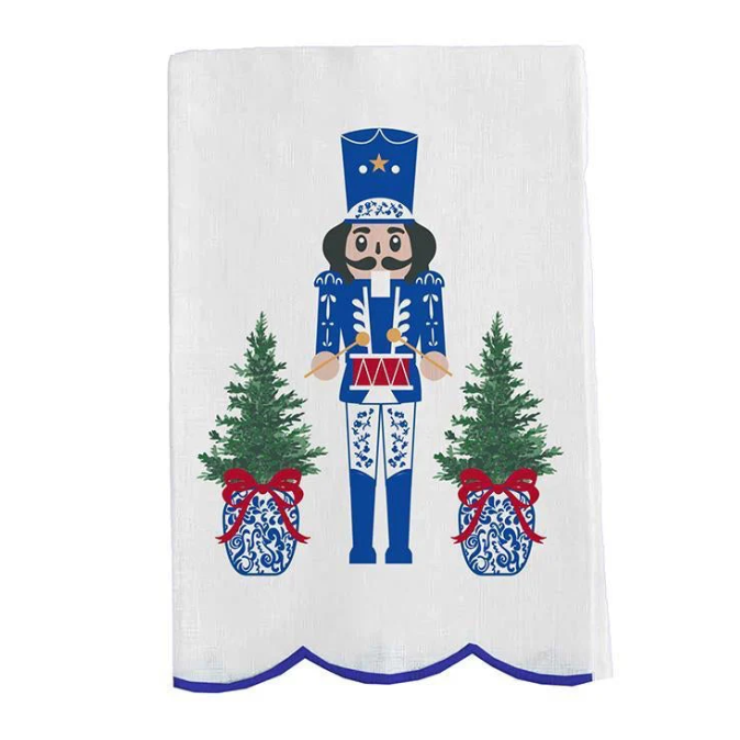 Set on a crisp white background, this towel features a regal blue and white nutcracker playing a red drum, flanked by two ginger jar–style Christmas trees topped with red bows. Along the bottom, soft blue scalloped edging adds a polished, feminine finish that completes the design with signature Pink Pineapple flair. Equally beautiful displayed or gifted, it’s the perfect way to add a touch of festive elegance to your home this season.