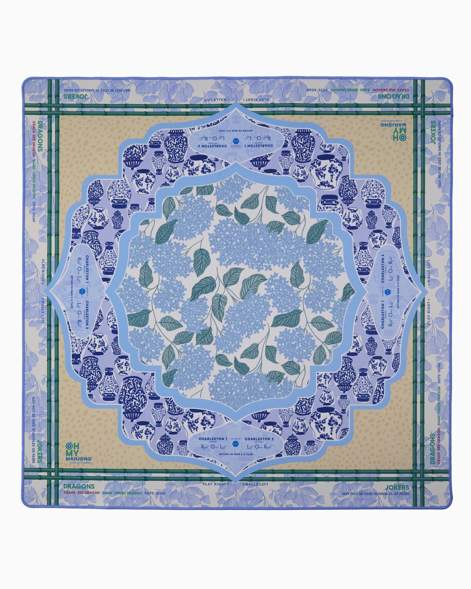 Designed with the high-quality durability Oh My Mahjong is known for, this mat not only enhances the visual experience but also improves playability. Tiles glide smoothly and stay in place throughout the game, giving you a seamless playing experience from start to finish. The hydrangea and ginger jar motifs add a refined, heritage-inspired feel while still keeping the overall look airy and coastal. Lightweight and easy to transport in its drawstring canvas bag, the Luna Mat is perfect for taking to game nights, gifting to Mahjong lovers, or enjoying as part of your personal collection. With its fresh palette and layered patterning, it pairs beautifully with crisp white tiles, soft pastels, and rich jewel tones alike, making it a timeless, versatile favorite for year-round play.