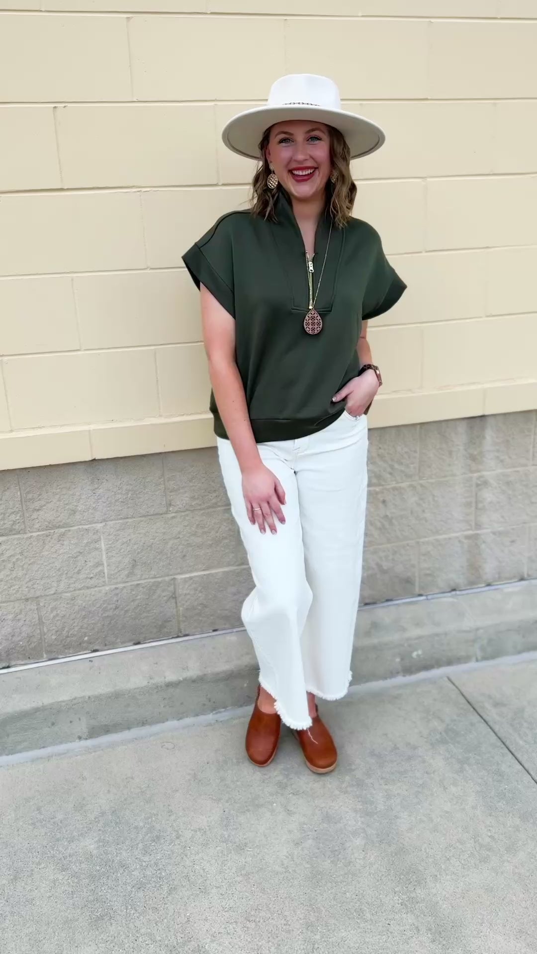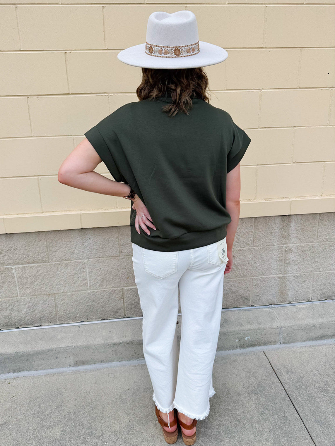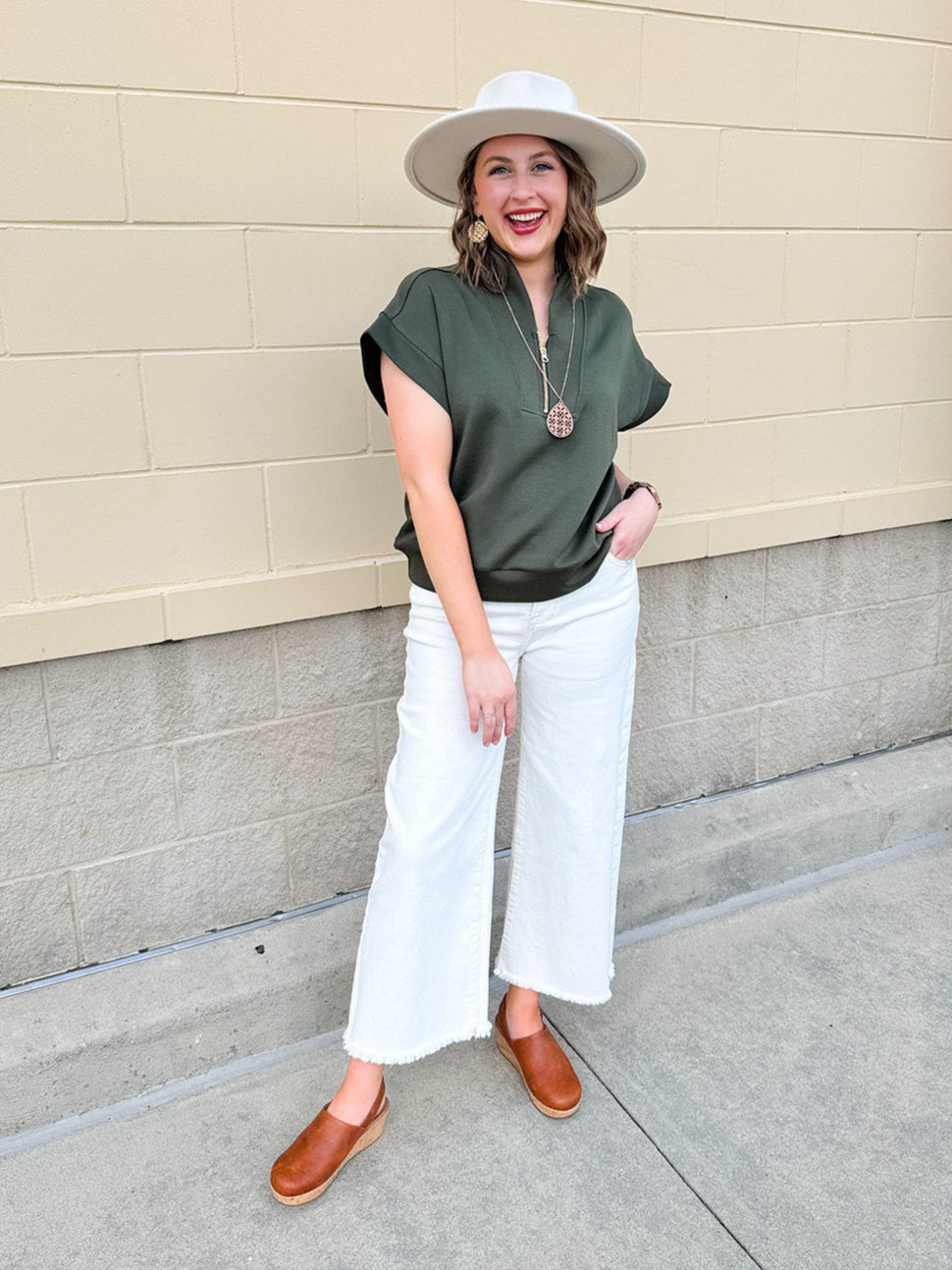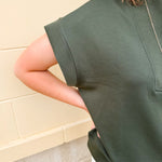 Meet your newest layering obsession—the Olive & Gold Half Zip Scuba Vest blends clean structure with subtle luxury. Crafted from smooth scuba fabric that holds its shape beautifully, this dark olive vest features a sleek high neck and bold gold zipper that instantly elevates any outfit. Whether you're throwing it on over a fitted long sleeve or pairing it with activewear for an off-duty look, this piece is equal parts cool and polished. Sporty, chic, and totally transitional, it’s a statement vest you’ll reach for again and again.