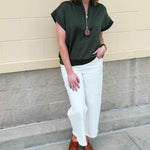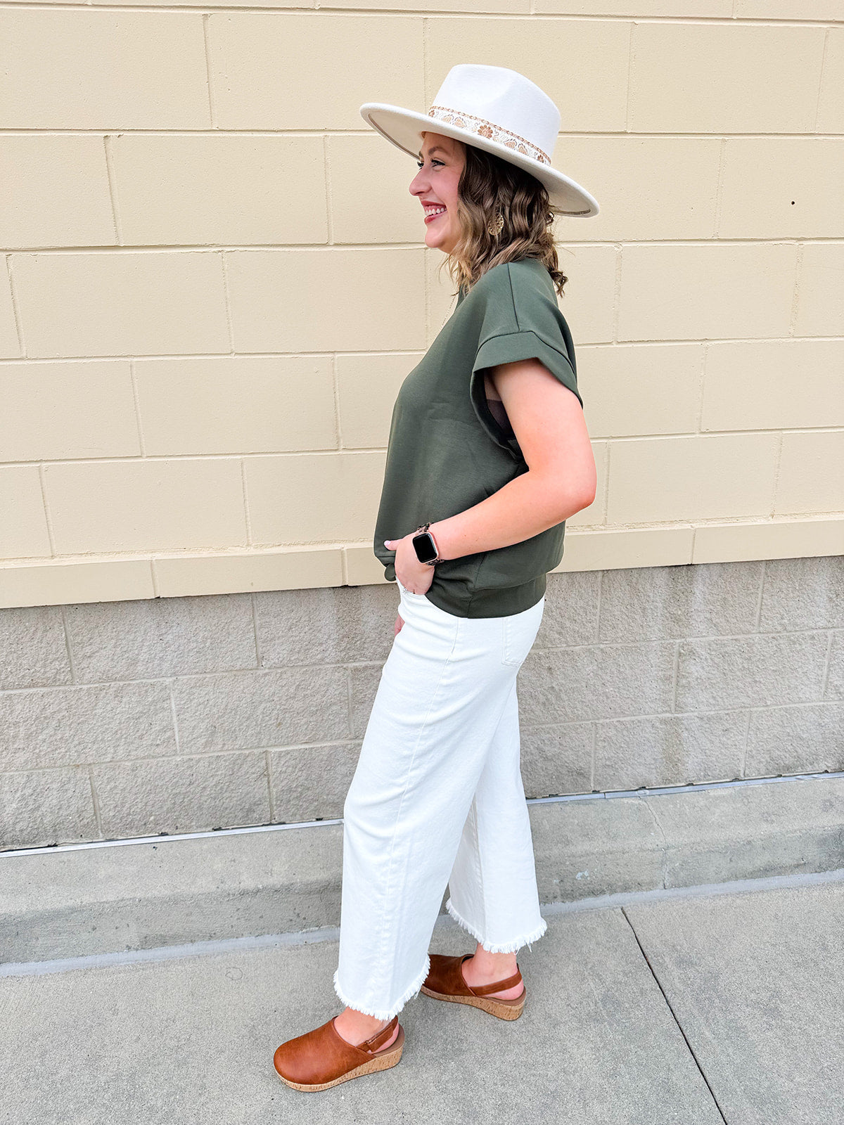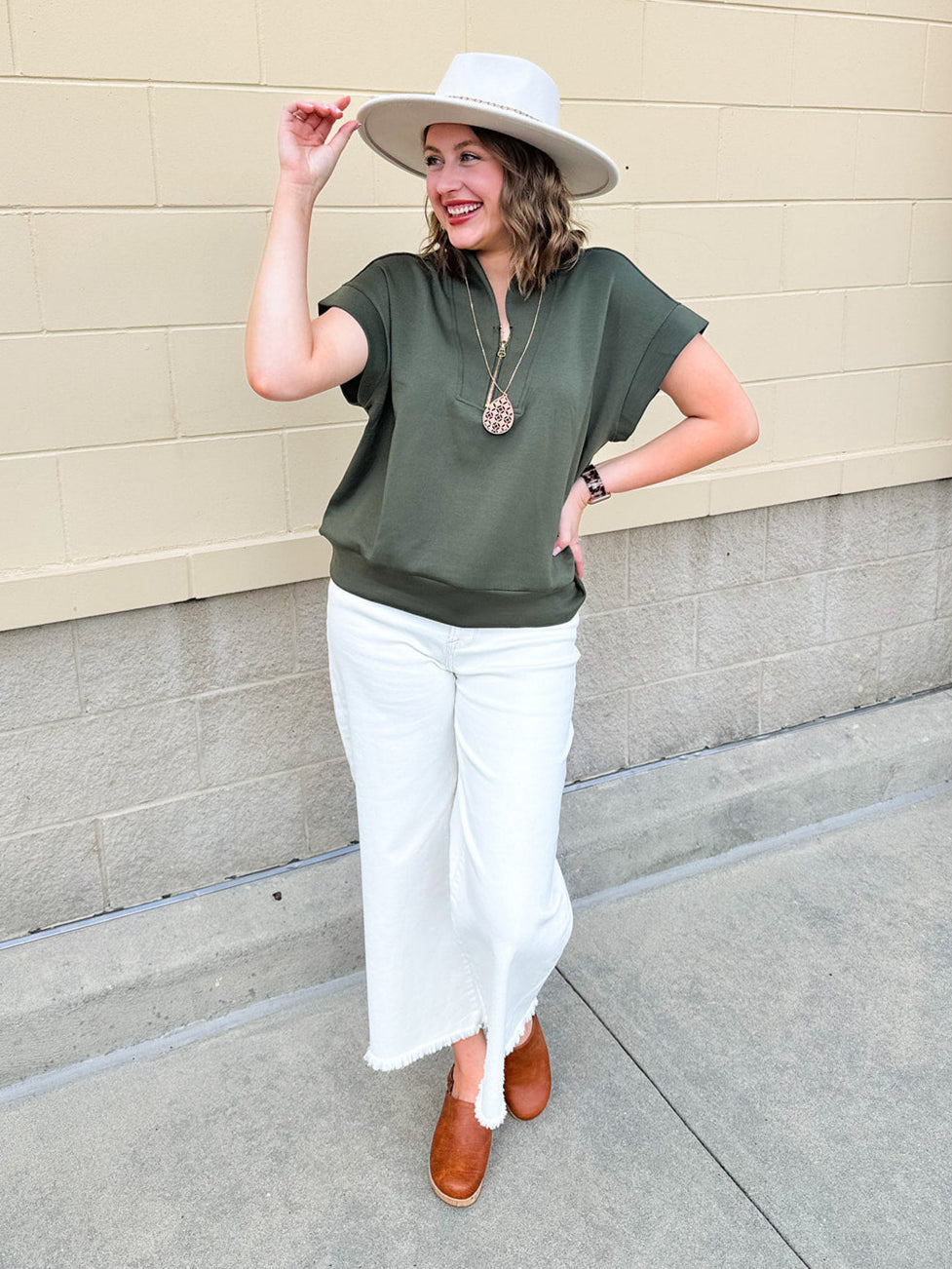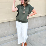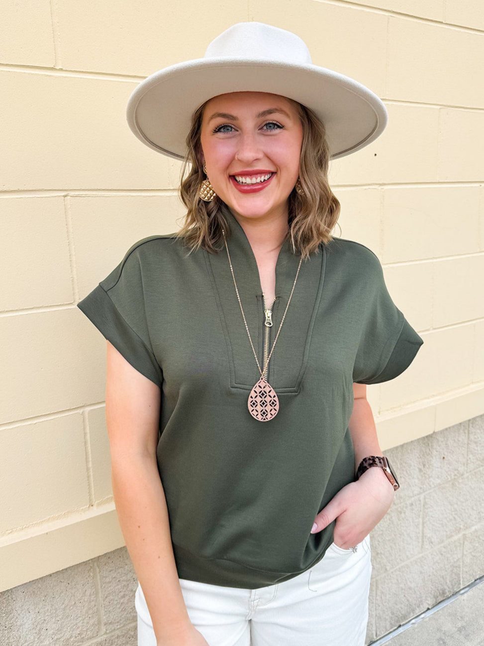 Meet your newest layering obsession—the Olive & Gold Half Zip Scuba Vest blends clean structure with subtle luxury. Crafted from smooth scuba fabric that holds its shape beautifully, this dark olive vest features a sleek high neck and bold gold zipper that instantly elevates any outfit. Whether you're throwing it on over a fitted long sleeve or pairing it with activewear for an off-duty look, this piece is equal parts cool and polished. Sporty, chic, and totally transitional, it’s a statement vest you’ll reach for again and again.