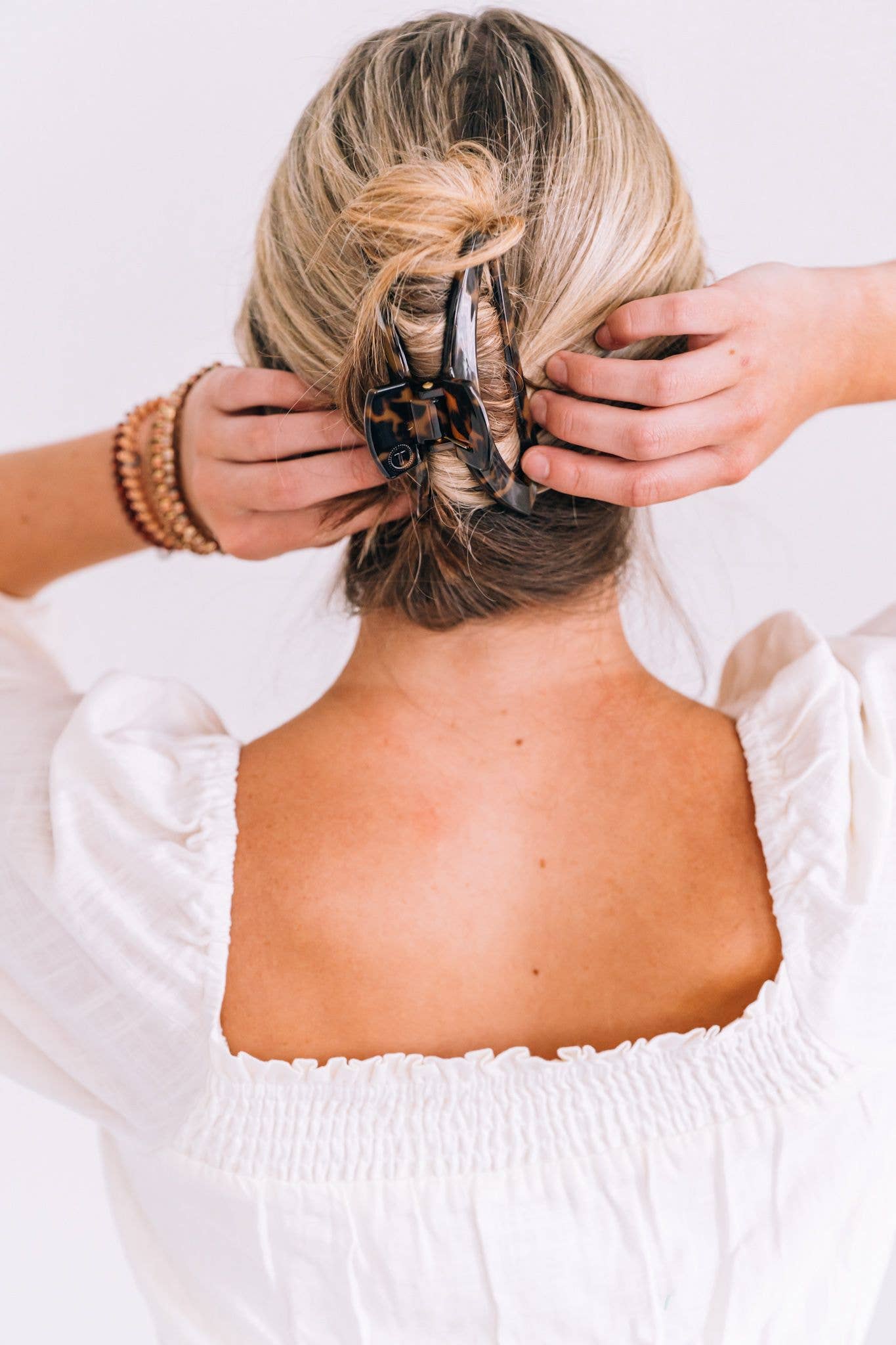 Looking for a clip that can handle thick hair with strength and style? The [TELETIES] Open Hair Clip – Large Tortoise is built to do it all. Styled in a timeless tortoise finish of black and brown, this clip pairs classic elegance with TELETIES’ unbeatable durability. Bendable teeth provide a secure, gentle grip that flexes back into shape, making it nearly unbreakable. At 4.5" long, the large size is perfect for thicker hair or creating full updos and buns. Lightweight and comfortable, it’s designed for all-day wear, from casual outings to polished occasions. The [TELETIES] Open Hair Clip – Large Tortoise is a true essential for thick hair and timeless style.