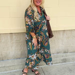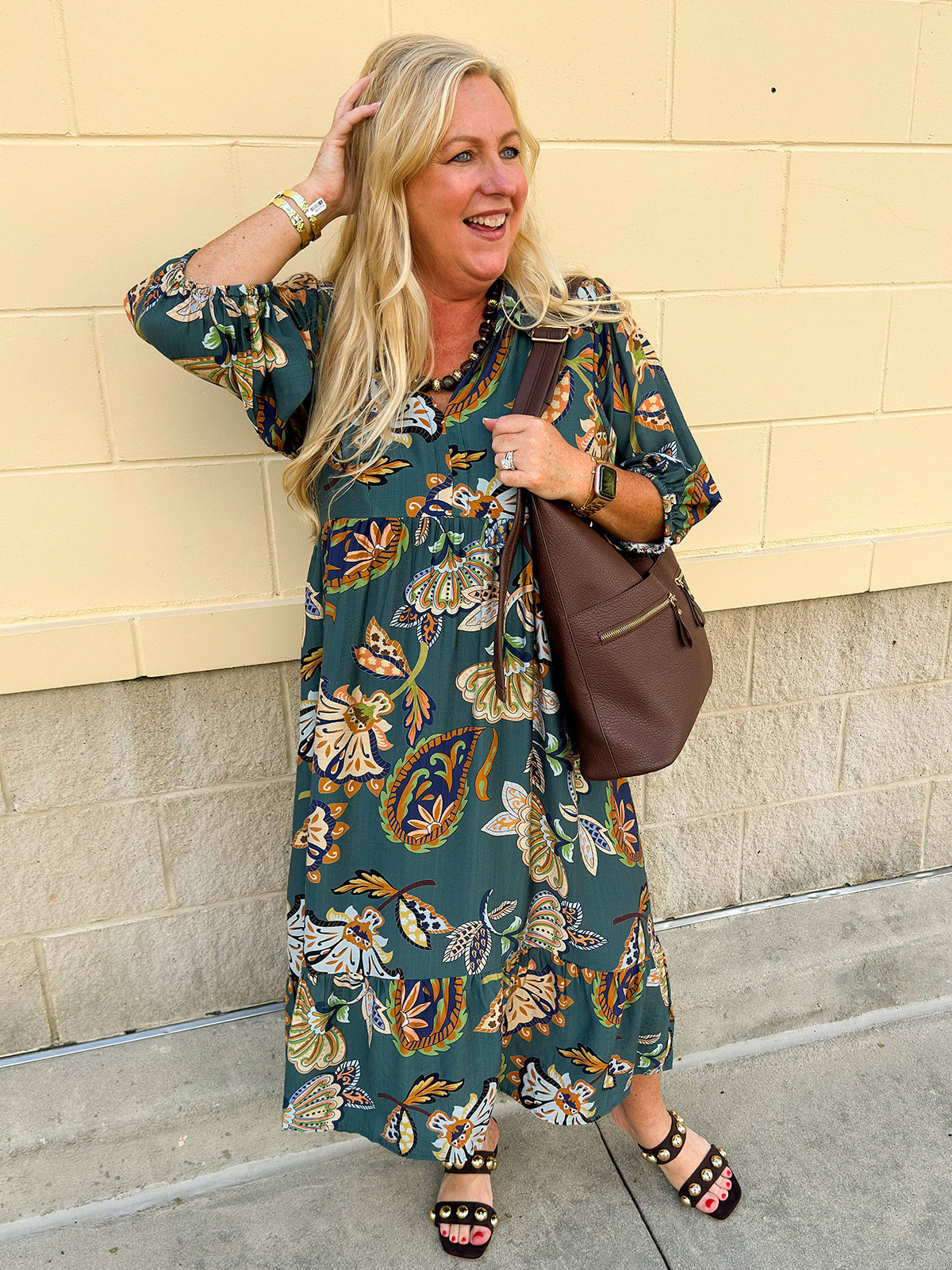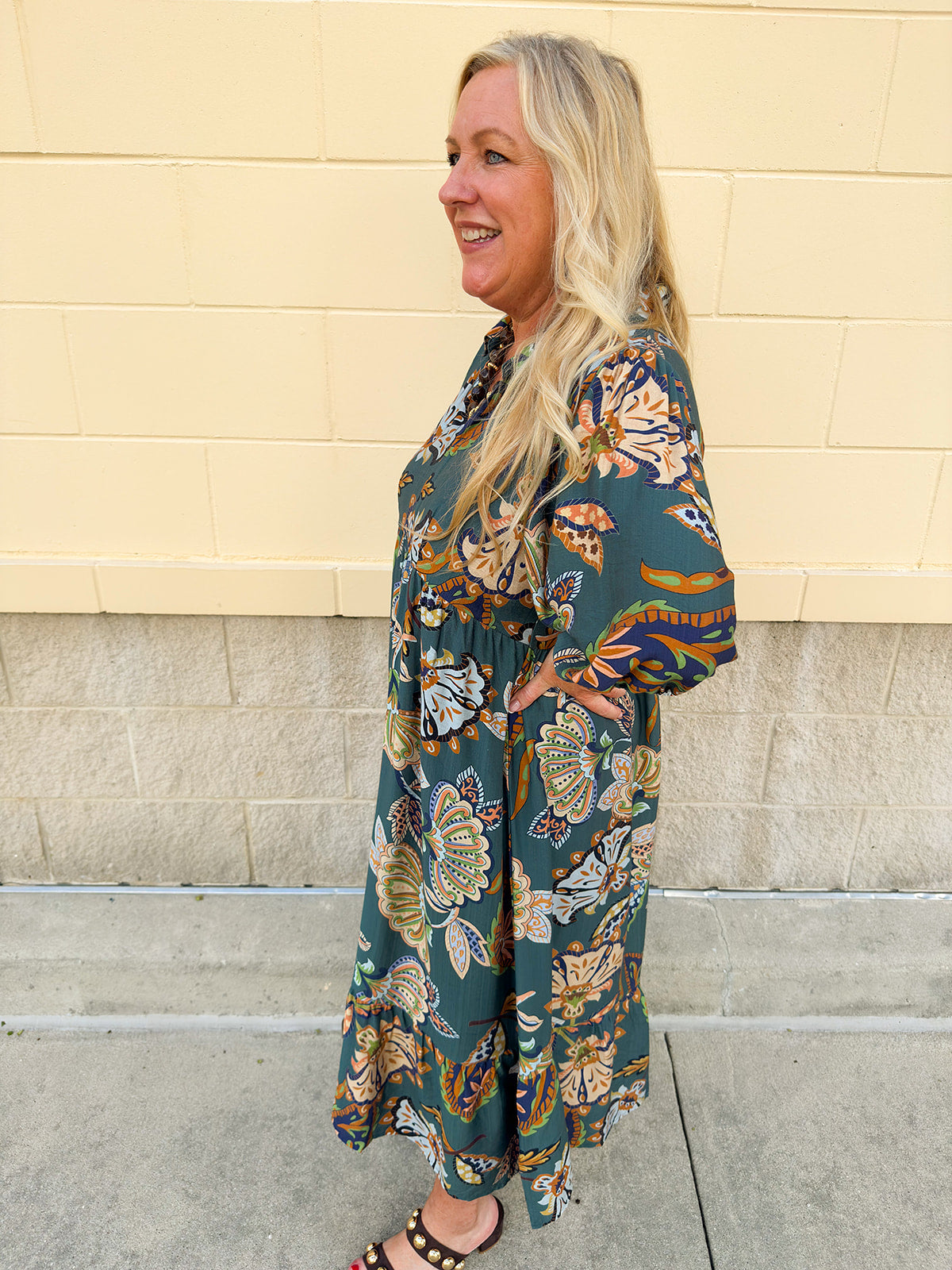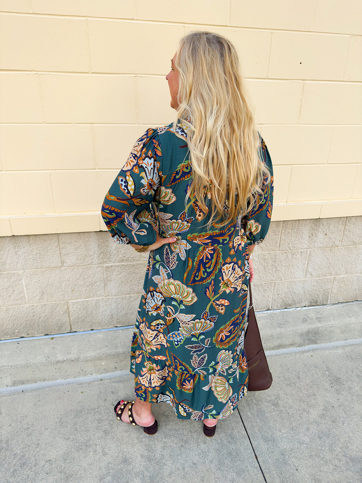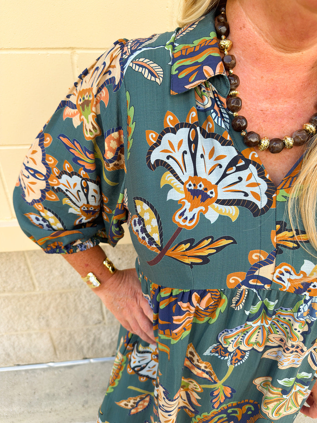 Effortlessly elegant and artfully detailed, the Painted Prairie Collared Midi Dress is a standout piece that feels equal parts timeless and fresh. Set against a rich teal base, its painterly floral-inspired print in soft orange, navy, and light blue brings a delicate vibrance to every step. The classic collared neckline adds structure, while the lined construction ensures all-day comfort and confidence. With a flattering midi length and easy flow, this dress moves gracefully from desk to dinner, errands to events—with zero effort required.