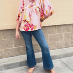 Soft, feminine, and effortlessly stylish, the Peach Blossom Babydoll Tie Top features a delicate blush floral print on a lightweight woven fabric. The babydoll silhouette with flowing batwing sleeves and two front ties creates a flattering, playful look perfect for spring and summer.