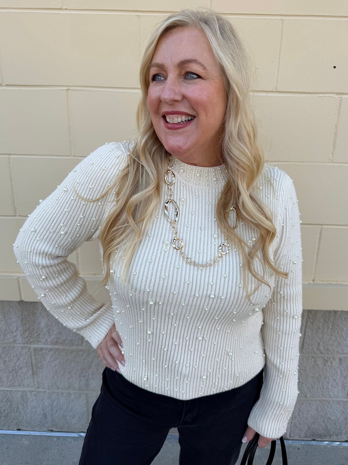 The Pearl Grace Ribbed Knit Top is the perfect blend of cozy texture and refined detail. Designed in a soft cream knit and finished with delicate pearl embellishments throughout, this top brings subtle elegance to an everyday silhouette.
