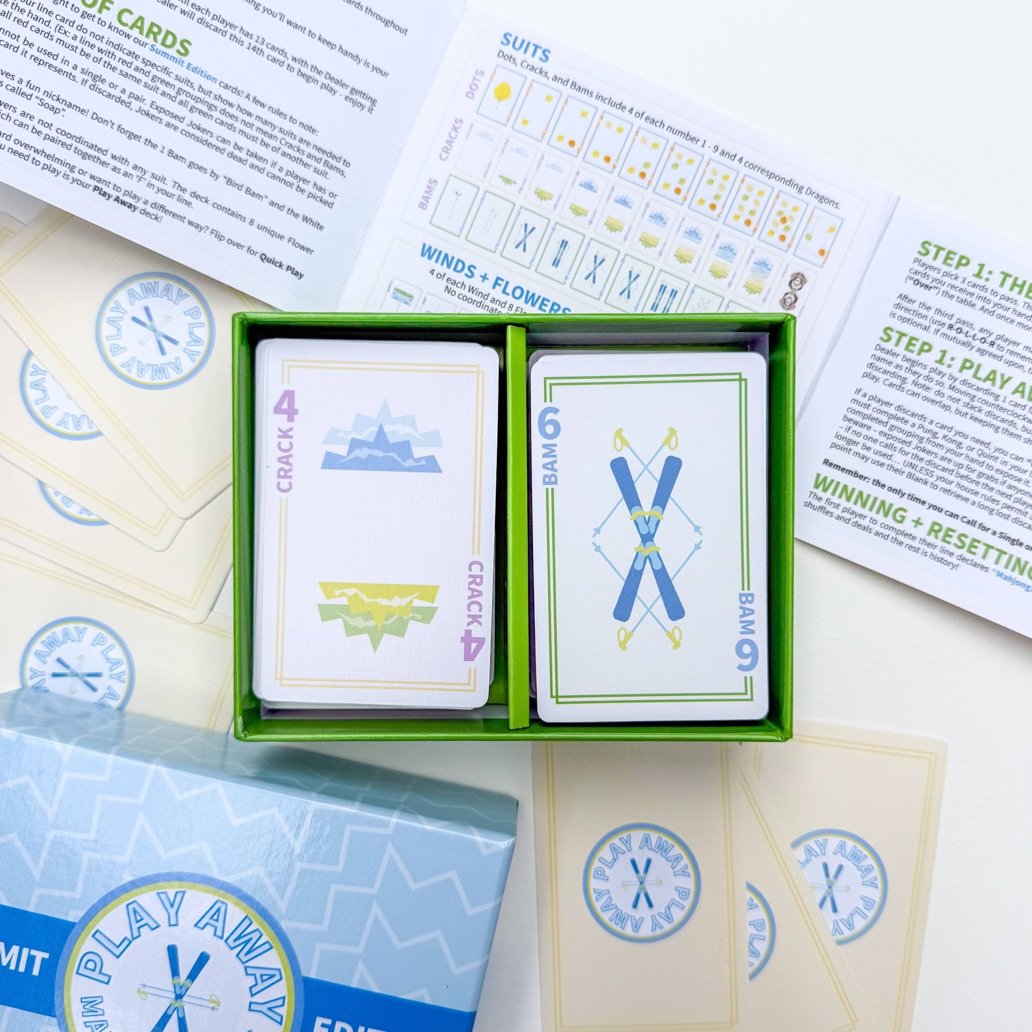 The Play Away Mahjong Cards: Summit Mountain Edition bring a fresh, adventurous twist to classic American Mahjong, perfect for beginners, travelers, and anyone who wants to play anytime, anywhere. Designed for easy, on-the-go fun, this set eliminates the need for racks, mats, or complicated setups—just open the box and you’re ready to play. Featuring 160 beautifully designed cards inspired by mountain peaks and the spirit of exploration, this edition makes learning and playing Mahjong more approachable than ever.