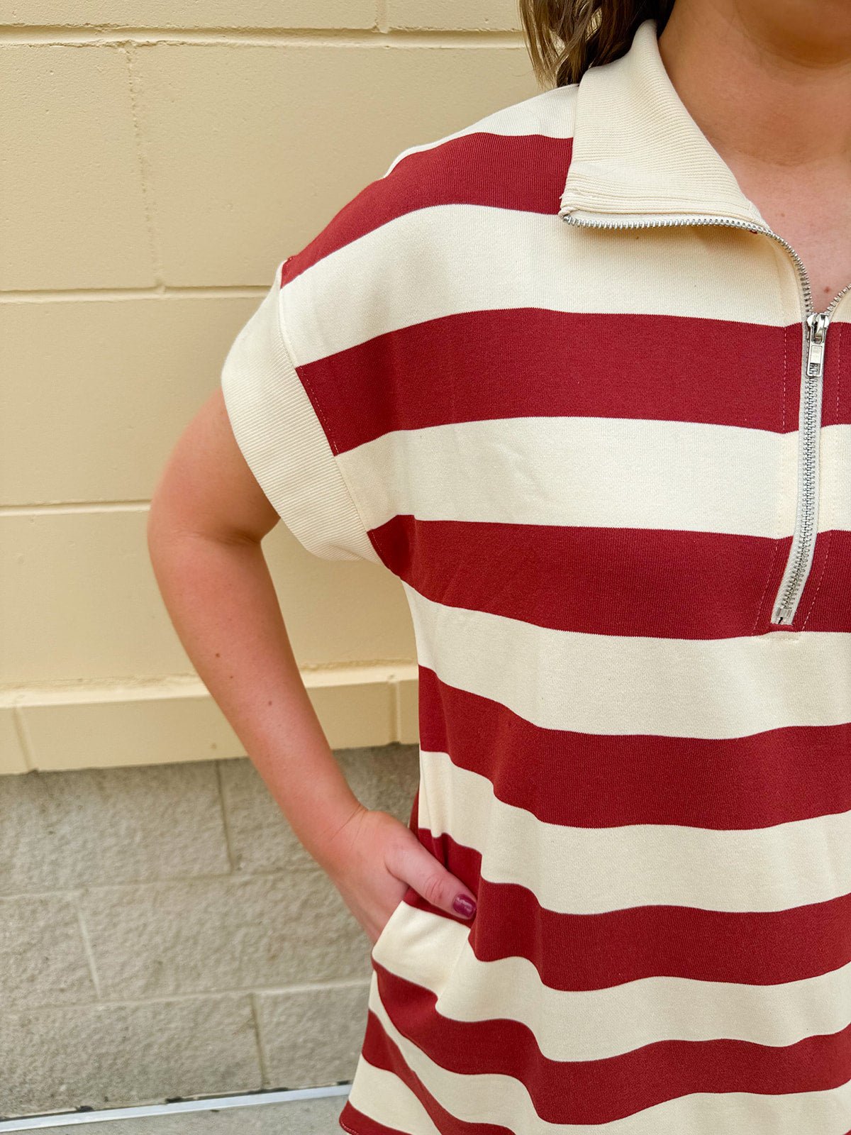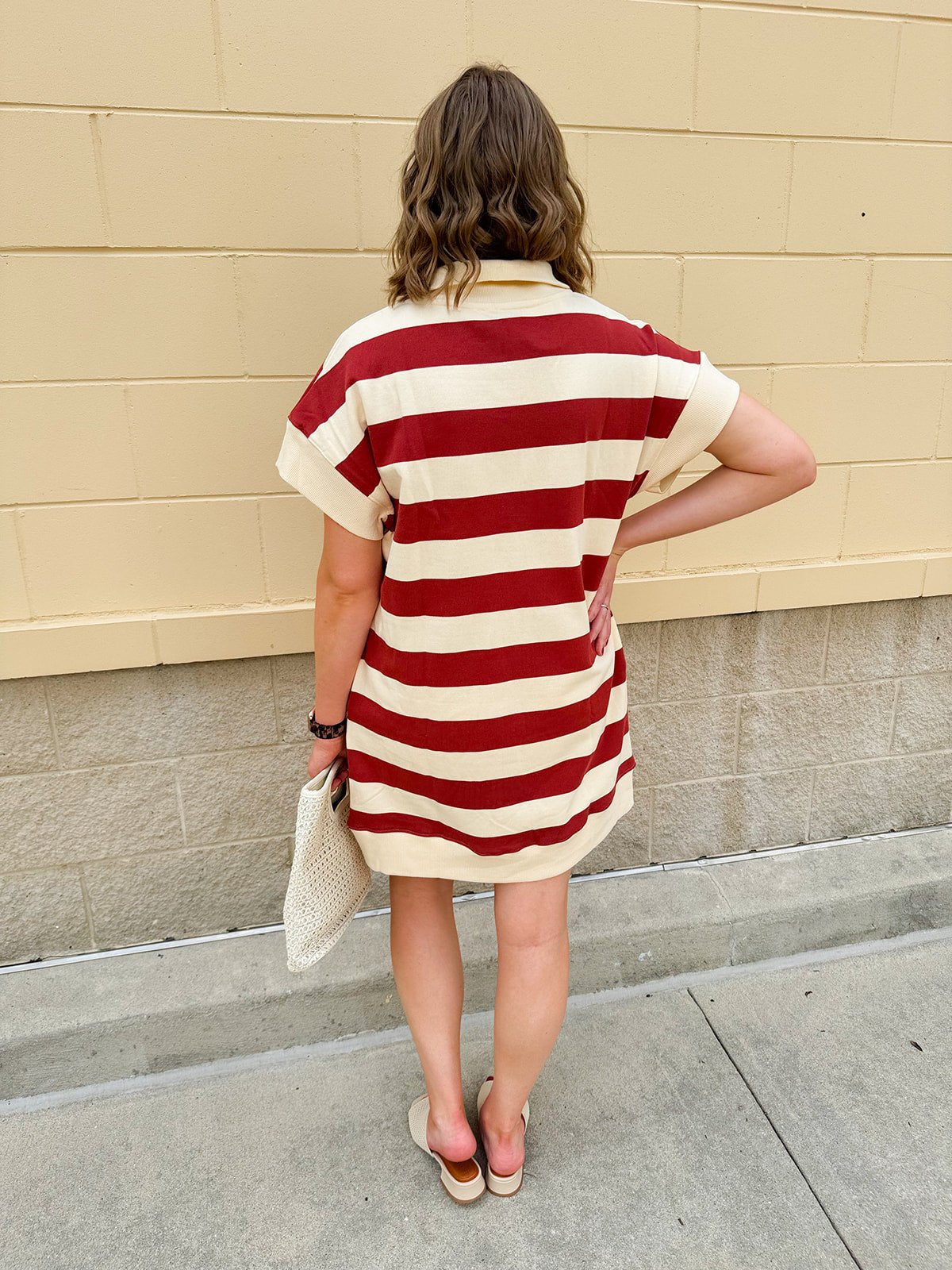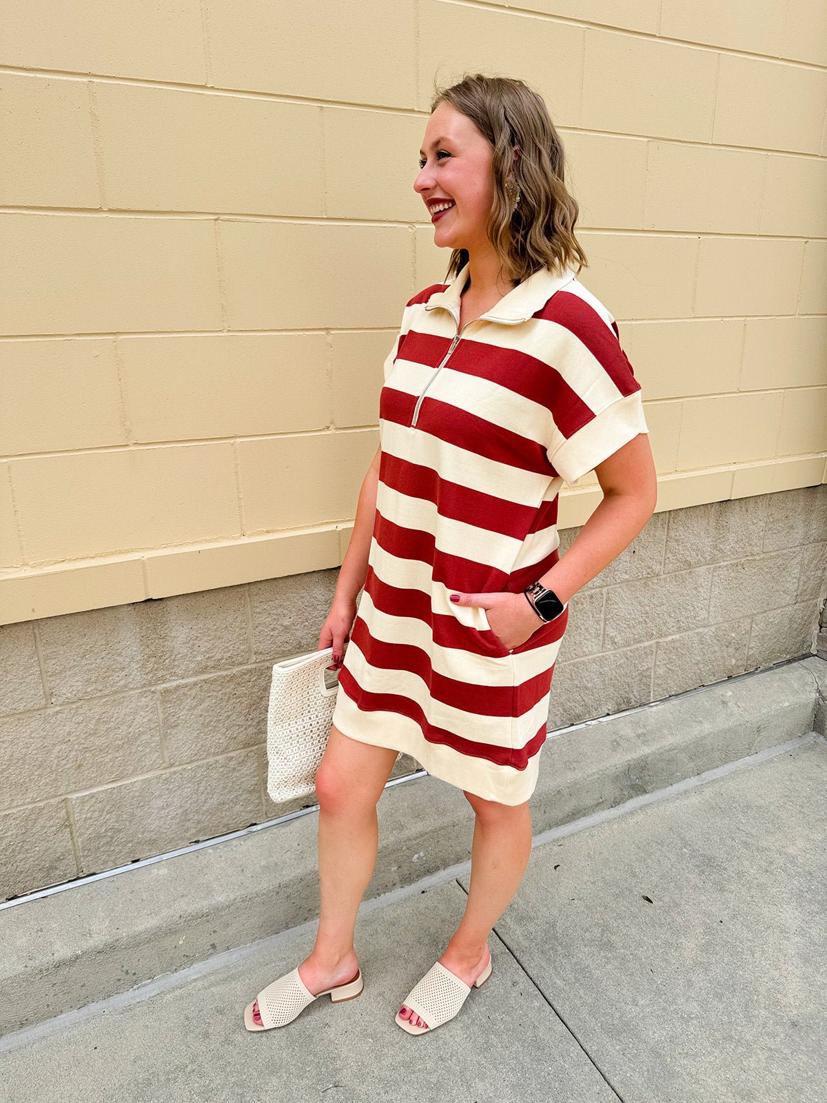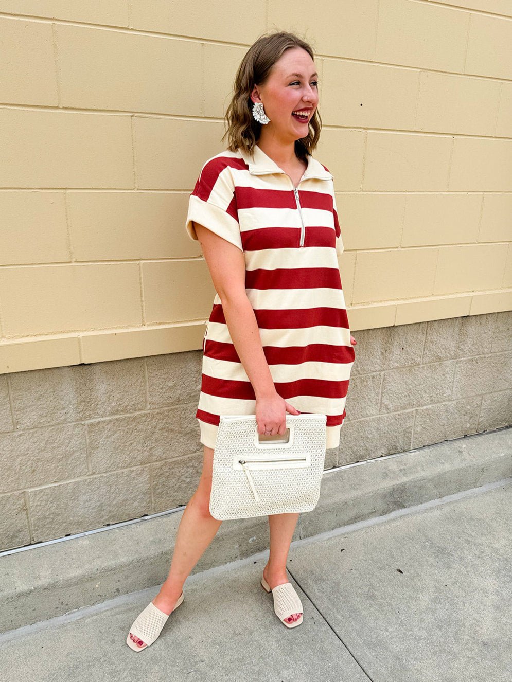 Be the best-dressed fan in the stands with the Renegade Cutie Zipper Collared Mini Dress! Sporty meets stylish in this gameday-ready mini featuring a playful split-neck zippered collar, cuffed short sleeves, and bold colorblock-style stripes that show off your team spirit in the cutest way possible. The mini length and relaxed silhouette make it breathable and easy to wear—whether you're tailgating, cheering from the bleachers, or headed out for post-game fun.