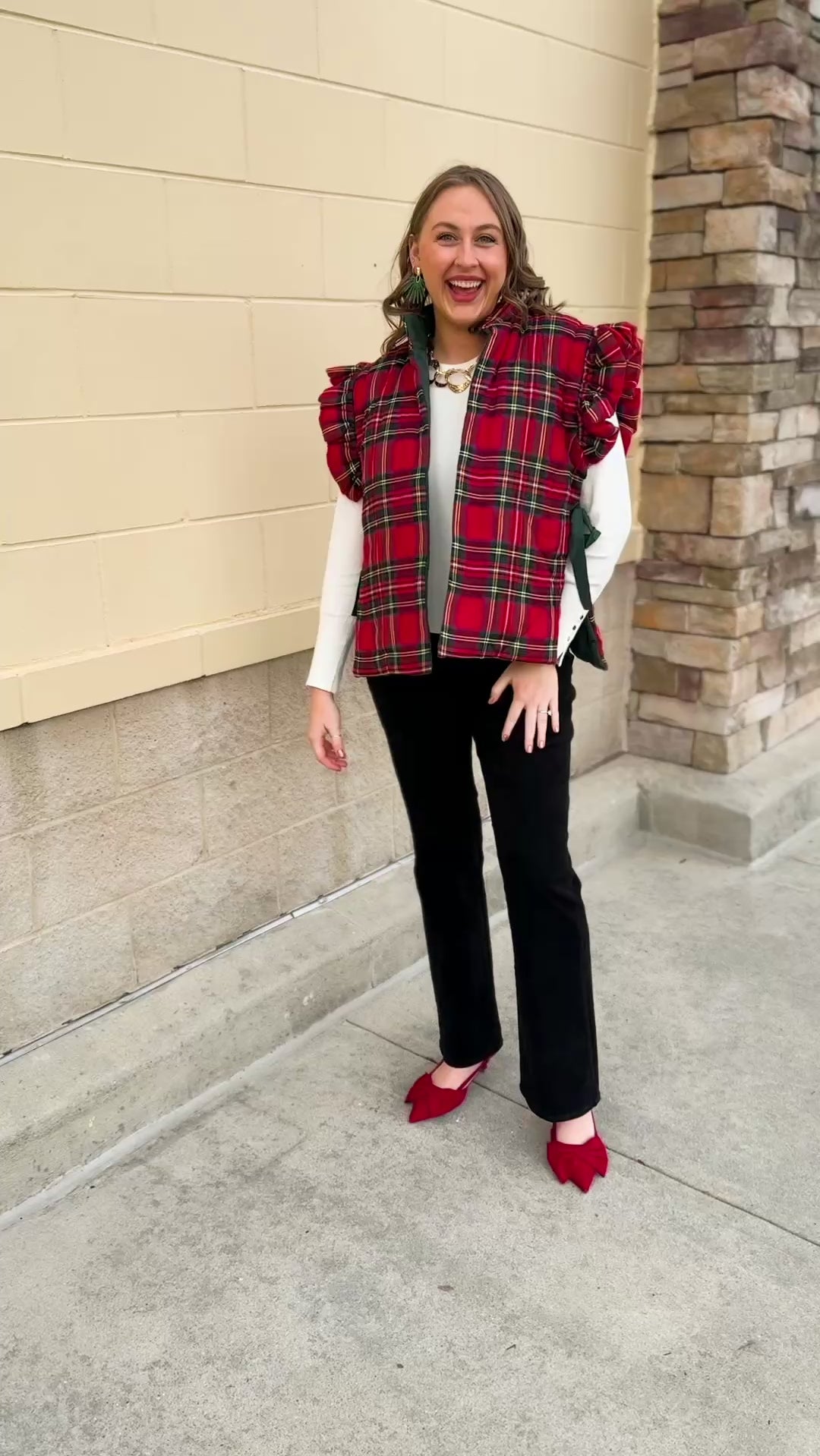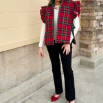 Need a piece that instantly turns any outfit into a statement? The Ruffle & Ready Reversible Vest in classic red and green tartan plaid brings timeless holiday charm with a playful twist. Its rich, festive colors are accented by feminine shoulder ruffles and adjustable cotton twill tape side ties for a perfect fit. And because versatility is always in style—it’s fully reversible, giving you two chic looks in one: the bold plaid side for seasonal flair, and the solid quilted side for a more understated, wear-anywhere vibe. Designed in a one-size-fits-most silhouette with a flattering 25" shoulder-to-hem length, it layers effortlessly over sweaters, dresses, and blouses. From holiday parties to cozy weekend strolls, this vest blends style, comfort, and practicality in every detail.