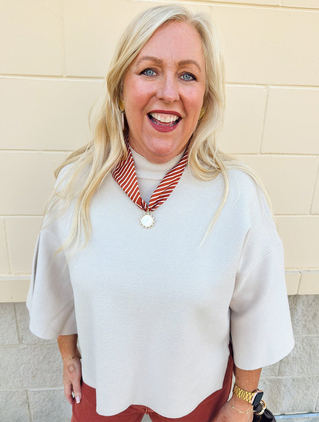 Soft, graceful, and effortlessly chic — The Sandstone Serenity Sweater brings refined comfort to your fall wardrobe. Crafted from a smooth viscose knit, this lightweight sweater drapes beautifully with a flattering high-low hem and relaxed fit. The elegant bell sleeves add subtle movement and charm, while ribbed neckline detailing and side slits give it a modern, boutique finish.