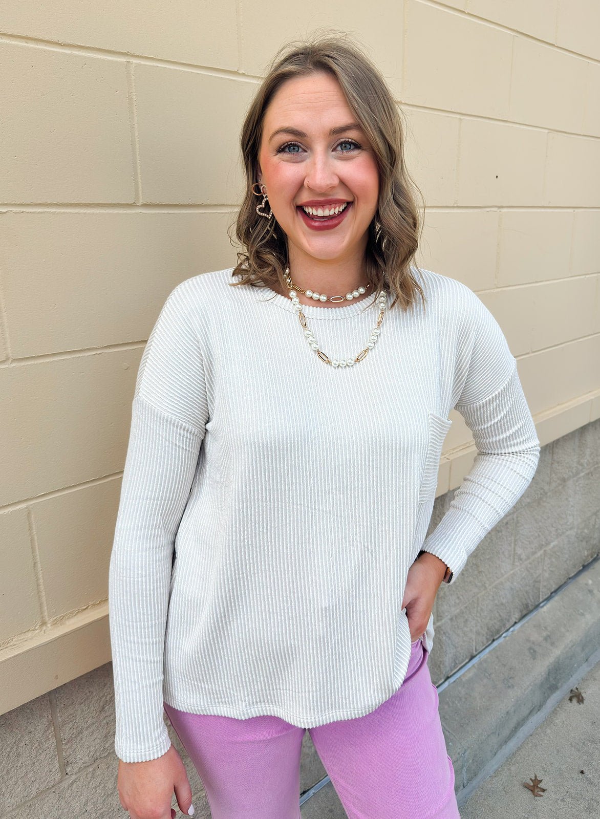 Elevated ease meets everyday comfort in the Sandstone Striped Oversized Top. Crafted from a soft ribbed knit with subtle horizontal stripes, this long sleeve essential brings just the right mix of texture and tone. The warm sand beige hue keeps things neutral and versatile, while the relaxed, oversized silhouette adds a cool, effortless vibe. Whether you’re dressing it up with trousers or keeping it casual with denim and sneakers, this is the kind of piece that looks chic without even trying.