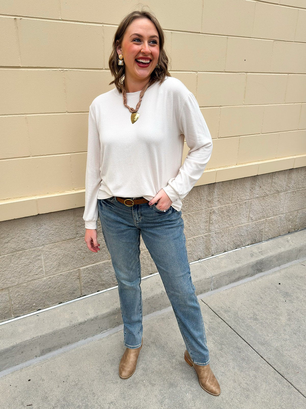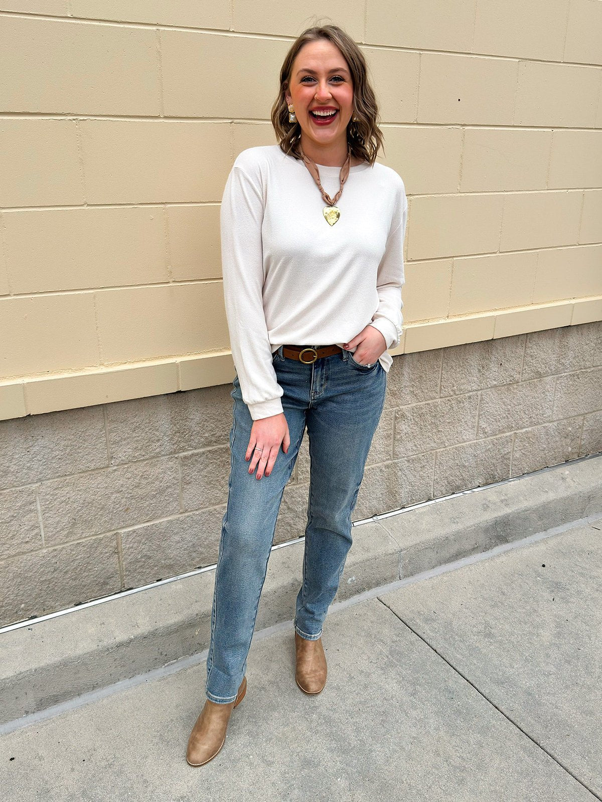 Easy, elevated, and endlessly wearable—the Sandswept Cinch Sleeve Tee is your new neutral essential. Designed in a soft sand beige hue, this long sleeve tee features a classic round neckline and subtle cinched detailing at the wrists for a modern, feminine twist. The fabric is lightweight yet substantial, offering a flattering drape you’ll reach for again and again. Whether layered under knits or styled solo, it brings quiet polish to your everyday style.
