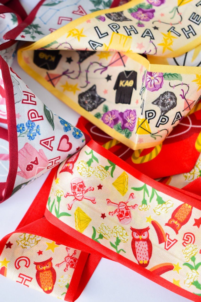 Graceful and versatile, the [SATURDAY SILKS] Kappa Alpha Theta Skinny Scarf blends timeless style with sorority pride. Crafted from 100% silk twill, this double-sided scarf features Kappa Alpha Theta’s iconic Greek letters alongside a playful schooled loop print. Perfect for styling in your hair, wrapping around your wrist, or tying on a handbag, it adds a subtle yet chic touch to any look. Designed in Houston, Texas, and gift packaged in a windowed tube tied with a bow, it’s the perfect keepsake for any Theta sister.