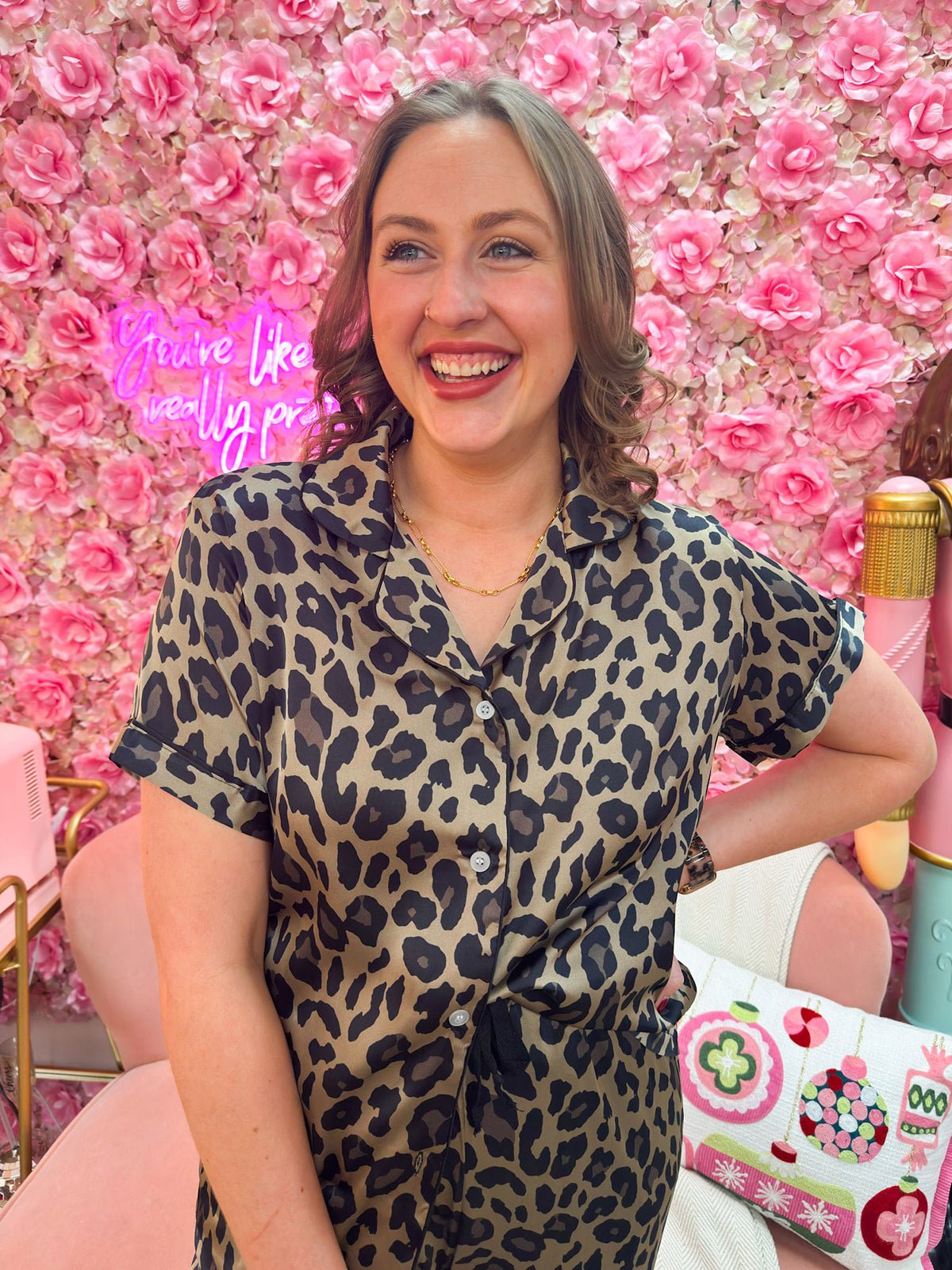 Looking for sleepwear that combines cozy comfort with playful style? The Savannah Chic Satin Pajama Top is crafted from silky satin that’s gentle on skin and hair, helping minimize dryness, frizz, and knots so you wake up feeling refreshed. Featuring a chic leopard print in warm browns and tans, this top brings a touch of bold, sophisticated style to your bedtime routine. Pair with matching bottoms for a coordinated set, or mix prints for a fun, luxe look.