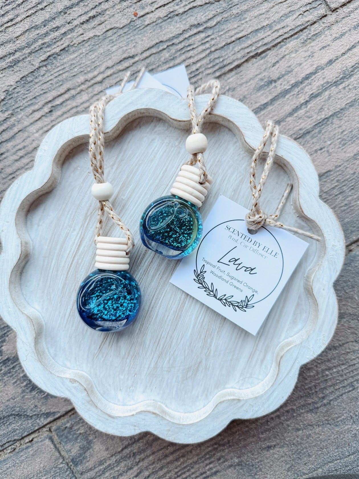 Handcrafted by Scented by Elle, this charming car accessory features a mini glass container filled with scented oil and eye-catching blue glitter that floats and shimmers as you drive. The bottle is topped with a wooden cap and accented with natural wooden beads, all hanging from a tan braided rope interwoven with metallic gold thread and finished with sleek aglets. It’s the perfect little pop of sparkle and scent for your car.