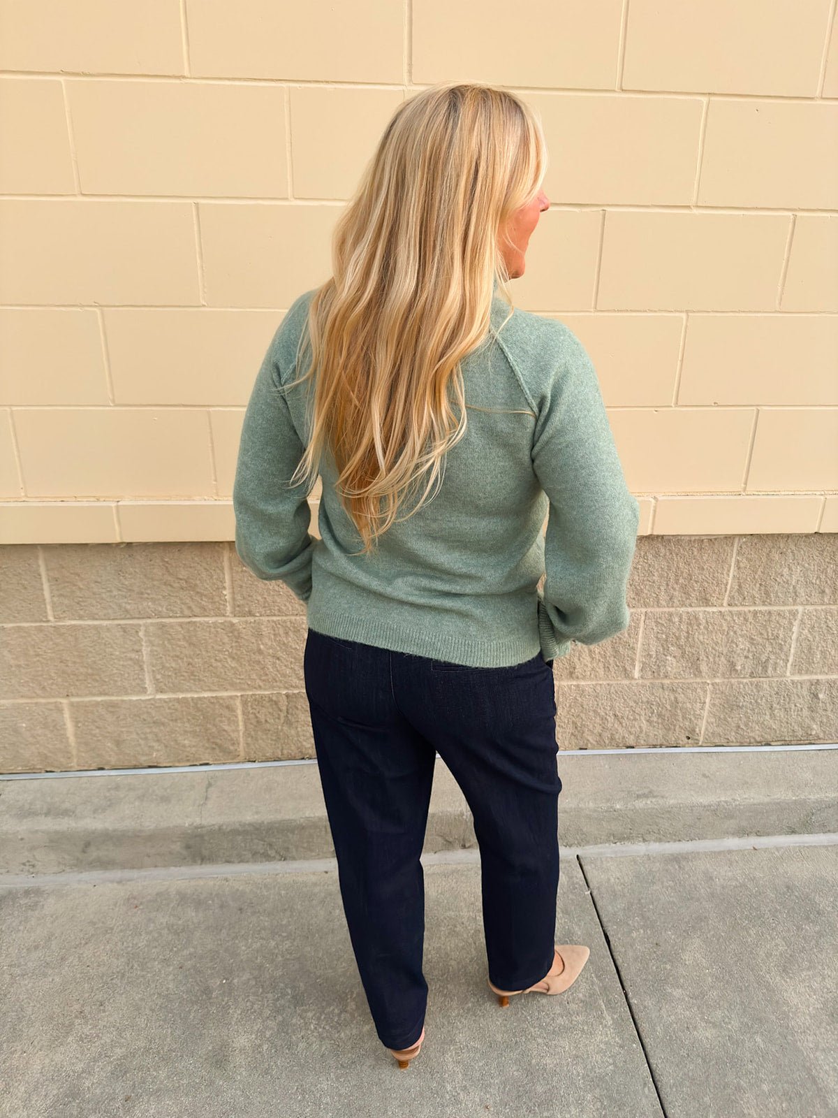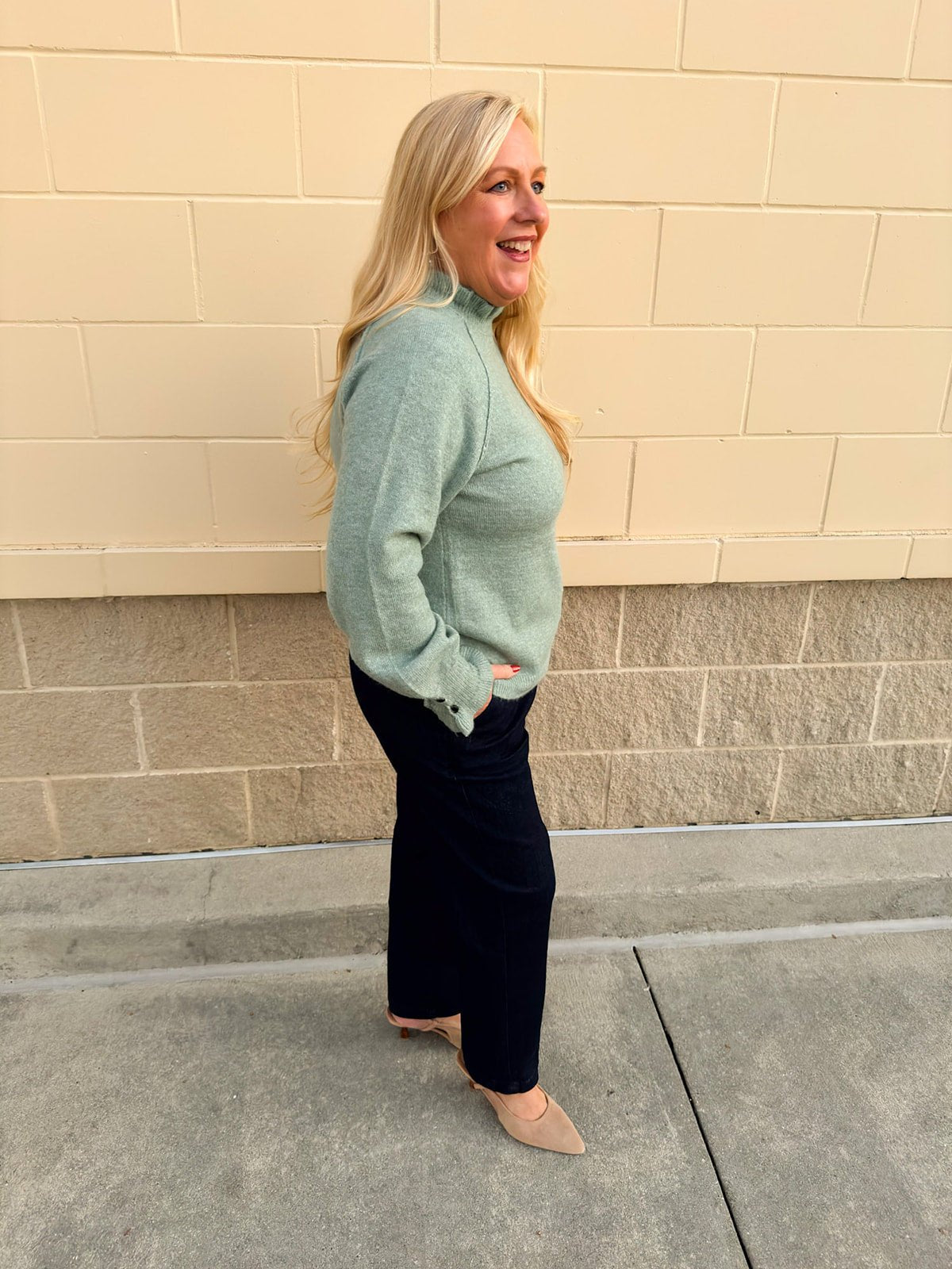 Looking for a sweater that feels as soft as it looks? Meet the Soft Serenity Ruffle Sweater — your go-to layering piece for cozy days and chic nights. This ultra-soft knit in a gentle, soft green hue brings just the right touch of femininity to your fall-to-holiday wardrobe. The ruffled mock neckline and delicate ruffle cuffs with button details add a pretty, elevated finish that’s equal parts timeless and trendy.