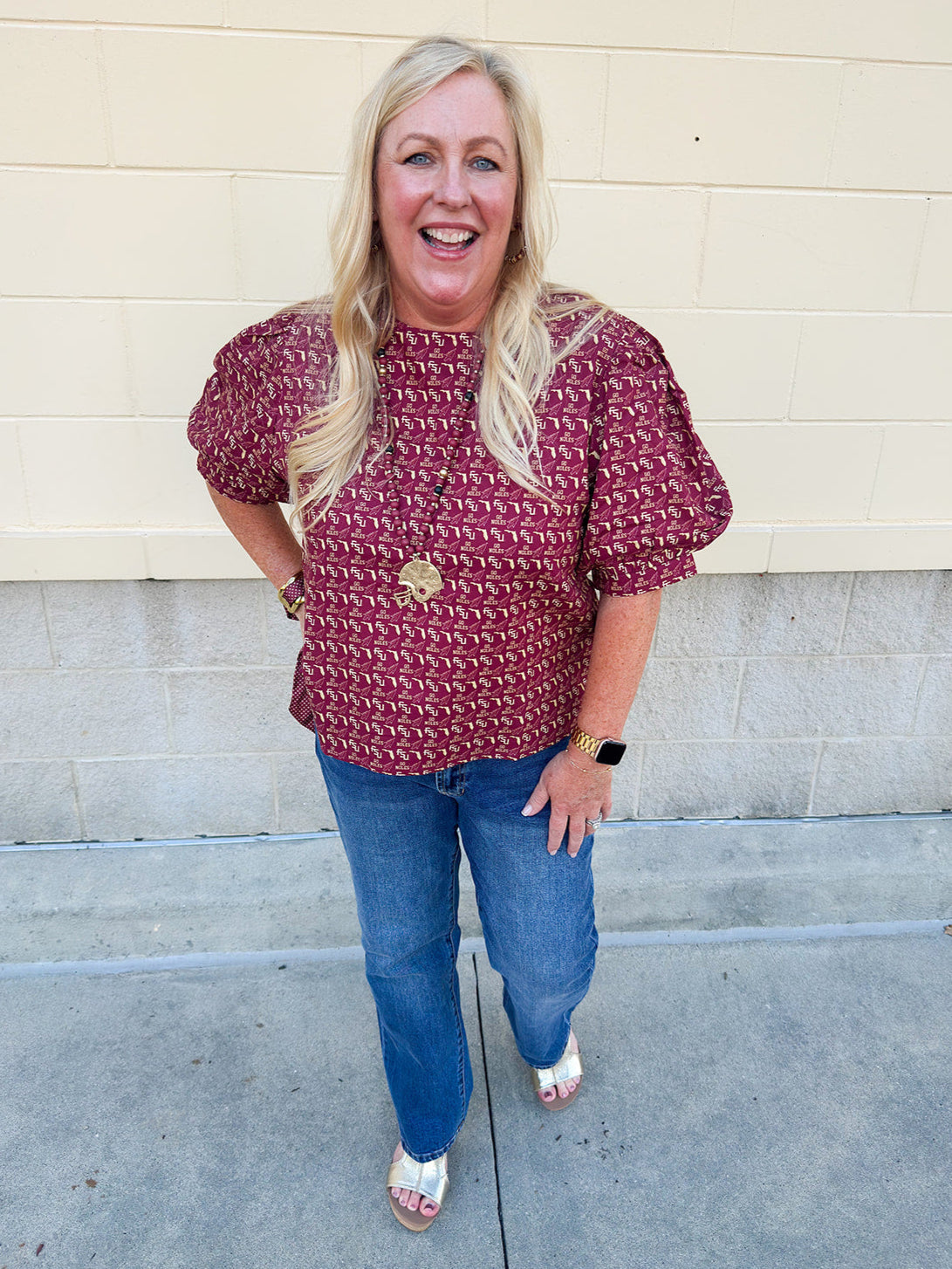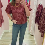 Polished, playful, and full of school pride—the Spirit State Blouse is a structured staple with a feminine twist. Crafted from soft brushed cotton twill, it’s designed with a relaxed fit that drapes beautifully while offering just the right amount of structure. The puff sleeves add a touch of sophistication, and the keyhole closure at the back keeps the look classic. Featuring an all-over pattern of “FSU,” “Go Noles,” the Florida state outline, and the spear, this blouse blends spirited style with boutique-level elegance. Perfect for game days when you want to look chic yet comfortable, this blouse is as versatile as it is spirited.